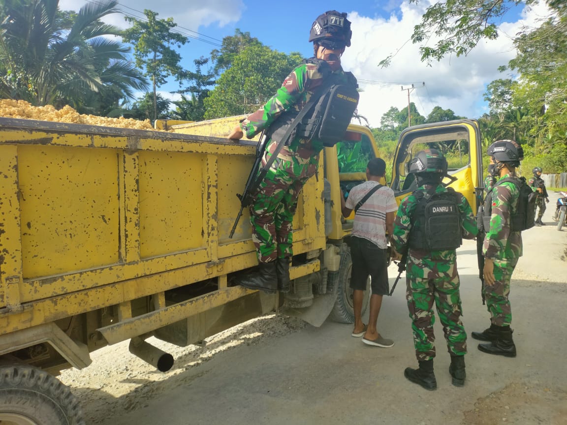 Guna mencegah terjadinya kegiatan ilegal di wilayah perbatasan antara Indonesia dan Papua Nugini, personel Satgas Pamtas RI-PNG Yonif 711/Rks menggelar sweeping di sepanjang jalan perbatasan RI-PNG.