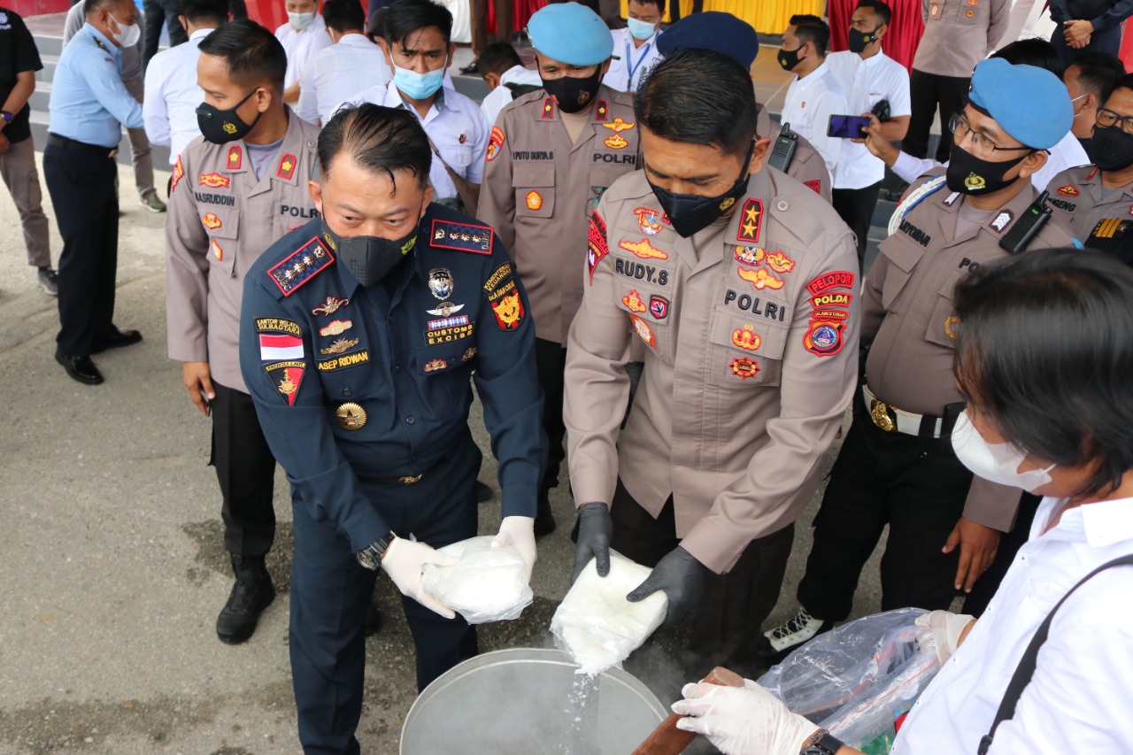 turut hadir dalam pemusnahan ini pejabat utama Polda Sulteng dan unsur forkopimda Sulawesi Tengah kemudian dirangkaikan dengan pemberian piagam penghargaan oleh kepala Bea dan Cukai Pantoloan kepada Polda Sulteng.