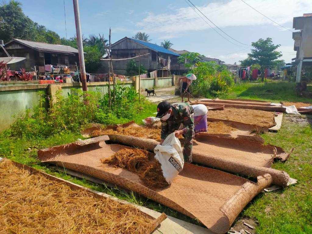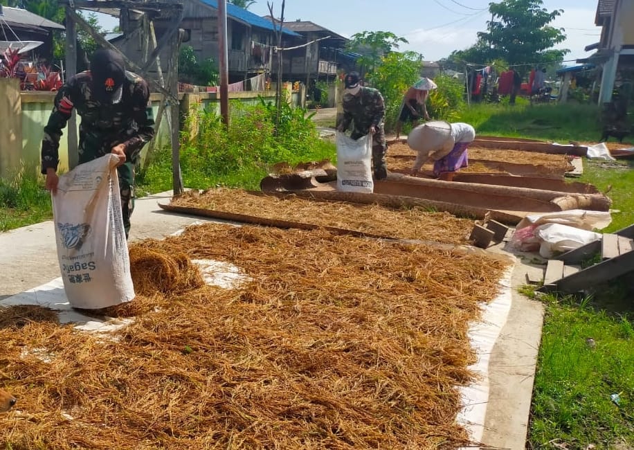 Anggota Satgas Pamtas RI-Malaysia Yonif 144/JY membantu warga Dayak iban Menjemur Padi di desa Langau Kecamatan Puring Kencana Kabupaten Kapuas Hulu Kalbar.