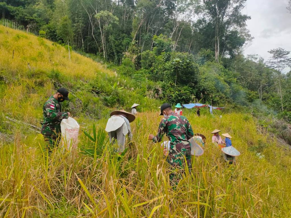 Anggota Satgas Pamtas RI-Malaysia Yonif 144/JY dukung ketahanan Pangan laksanakan Panen Padi darat bersama warga di desa Merakai Panjang kecamatan Puring Kencana Kabupaten Kapuas Hulu Kalbar.