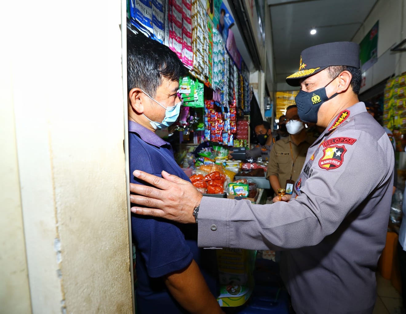 Kapolri Jenderal Polisi Listyo Sigit Prabowo meninjau Pasar Sehat Sabilulungan Soreang, Kabupaten Bandung, Jawa Barat, Kamis (24/3/2022). Dalam kunjungannya tersebut, Sigit ingin memastikan proses distribusi berjalan lancar, ketersediaan minyak goreng khususnya jenis curah tersedia dan penjualannya sesuai dengan kebijakan Harga Eceran Tertinggi (HET) yang ditetapkan Pemerintah.