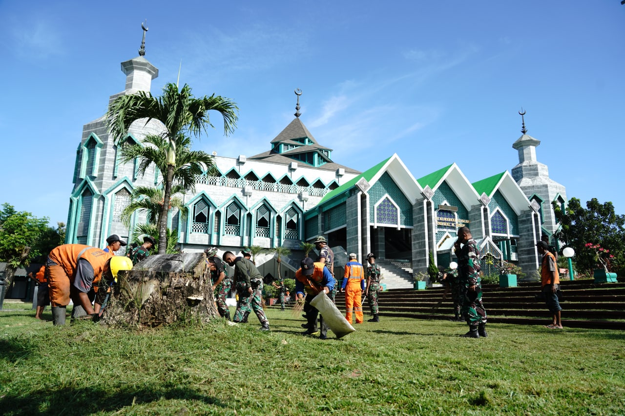 Sebanyak 1000 orang yang terdiri dari Prajurit TNI Angkatan Darat, Angkatan Udara, Angkatan Laut dan Polri serta Satpol PP Kota Makassar, Banteng Komando, Mahasiswa, Dinas Kebersihan Kota Makassar serta Masyarakat sekitarnya menggelar karya bakti, pembersihan dan perbaikan masjid dalam rangka menyambut bulan Suci Ramadhan 1443 H/2022 M, bertempat di Masjid Al-Markaz Al-Islami Kota Makassar, Jumat (25/03/2022).