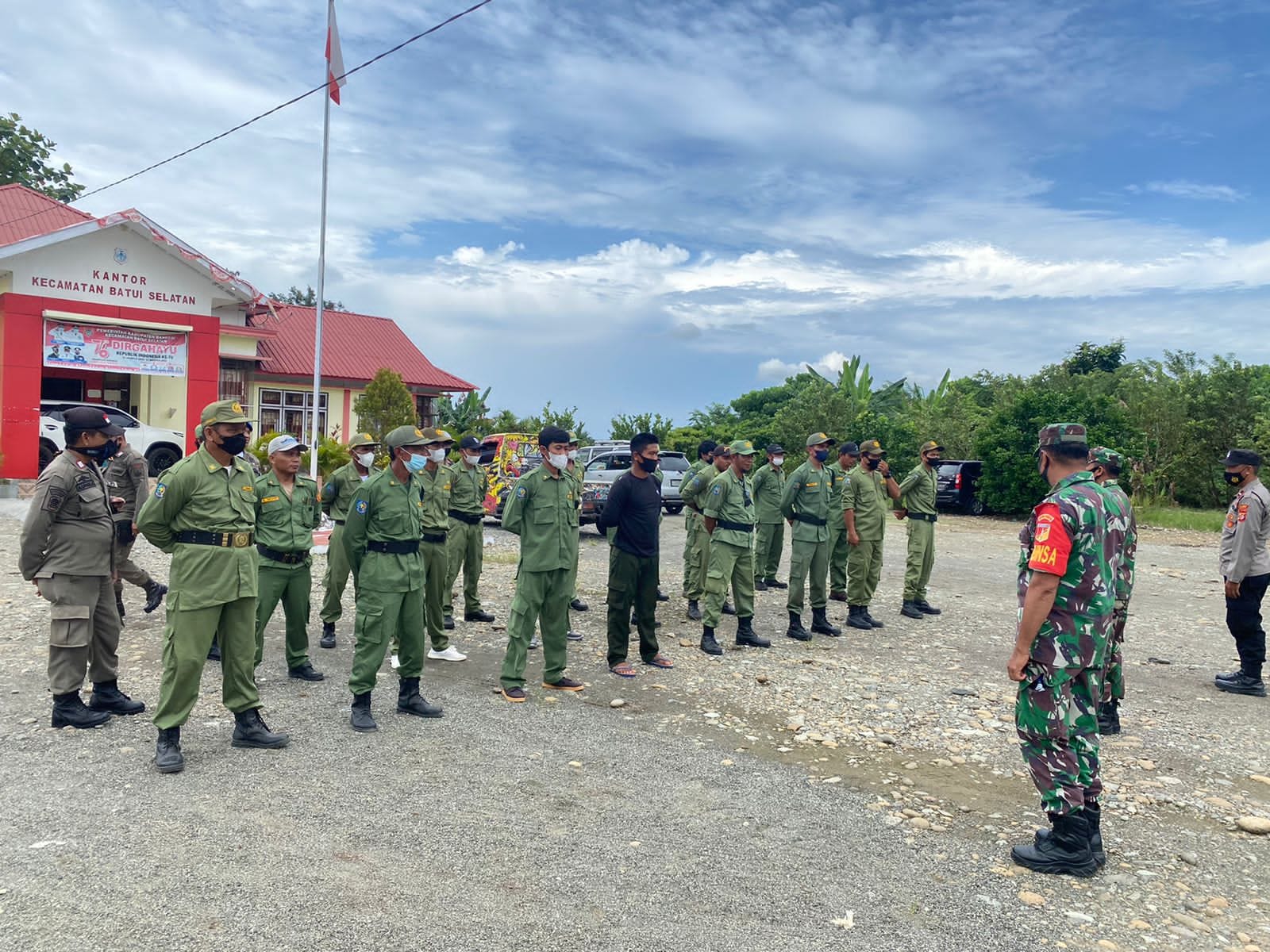 Kasubsektor Batui Selatan Iptu Safi Badi bersama Bhabinkamtibmas Aipda Ilham Daeng Maroa mengikuti pembukaan pendidikan dan pelatihan Peraturan Baris Berbaris (PBB) kepada Anggota Linmas di Kantor Camat Batui Selatan, Kamis (24/3/2022).