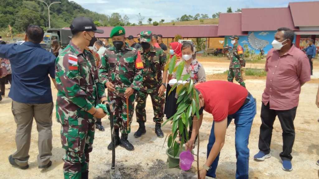 “Kami mendampingi Pangkoopsdam XII/TPR Mayor jenderal TNI Sulaiman Agusto, S.I.P,.M.M beserta rombongan, bersinergi dengan Polri dan Muspika,serta Patih dan tokoh masyarakat Kecamatan Badau, dalam rangka Penanaman sebanyak delapan pohon durian di Lemba Bukit Semugang.