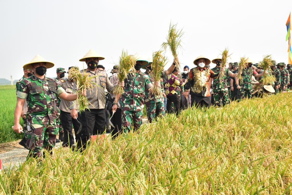 Kabupaten Bekasi. Mendukung program pemerintah dalam swasembada pangan, Pangdam Jaya Mayjen TNI Untung Budiharto bersama Muspida Kabupaten Bekasi. Lakukan panen raya padi dan penanaman jagung perdana, di Desa Wanajaya Kecamatan. Cibitung. Kabupaten Bekasi. Kamis (31/3/2022).