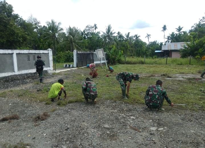 Bersama warga Kampung perbatasan RI-PNG anggota Pos Wembi Satgas Pamtas RI-PNG Yonif 711/Rks, melaksanakan Karya Bhakti di Desa Piyawi, Kecamatan Arso Timur Kabupaten Keerom, Papua.