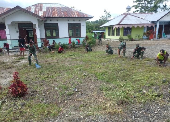 Danpos menyampaikan, ” kegiatan ini dilakukan oleh Pos Satgas Wembi bekerjasama dengan warga membersihkan kantor desa, mulai dengan pemotongan rumput di sekitaran kantor desa, pembersihan parit-parit, dan halaman Kantor desa bersama warga.