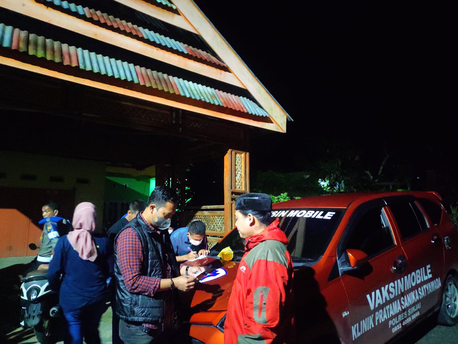 Dalam rangka mempercepat vaksinasi guna terbentuknya herd Immunity, Tim Vaksinator Polres Sinjai melaksanakan vaksinasi mobile di Kecamatan Sinjai Borong untuk memberikan kesempatan kepada masyarakat yang belum mendapatkan pelayanan vaksinasi, Selasa malam (5/4/2022).