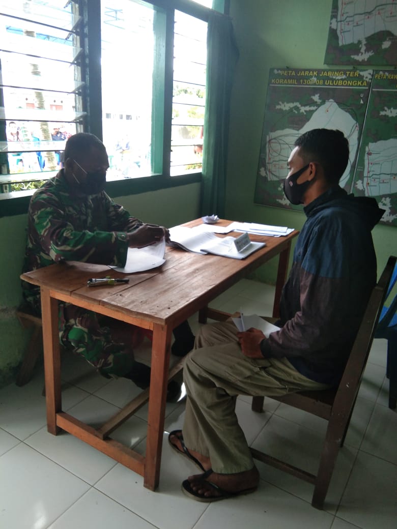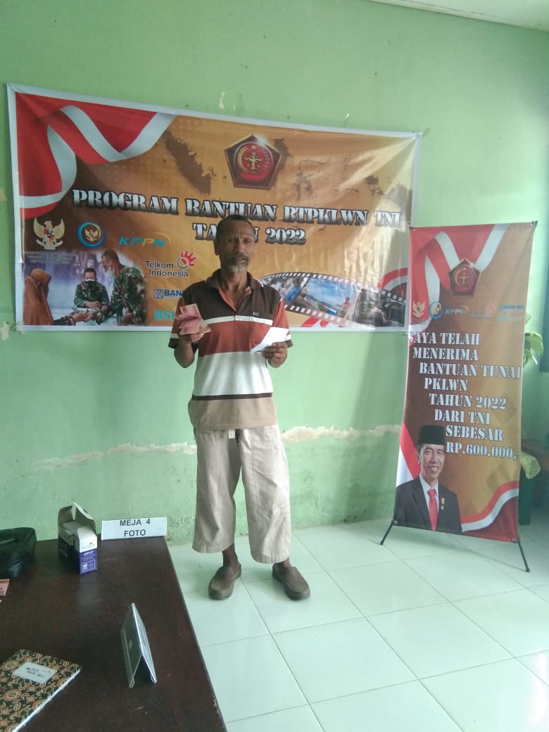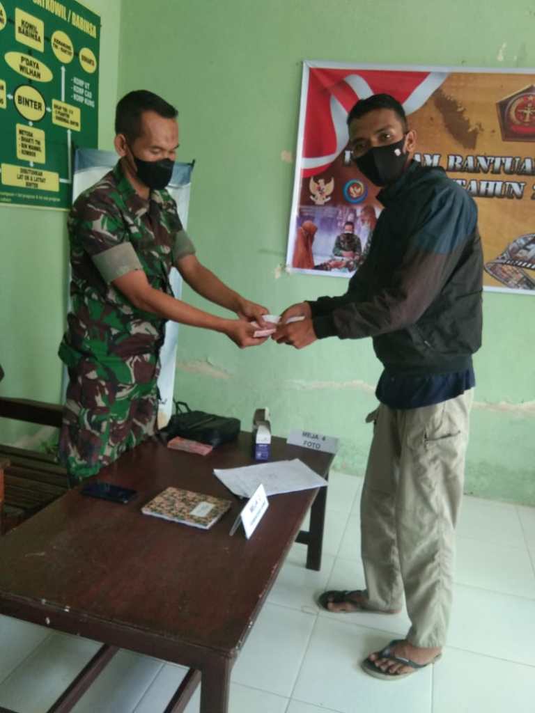 Personil Koramil 1307-08 Ulubongka menyalurkan Bantuan Tunai Padagang kaki lima, warung dan nelayan (BT-PKLWN) di kantor koramil 1307-08 Ulubongka, Kecamatan Ulubongka Kabupaten Tojo Una Una Provinsi Sulawesi Tengah.