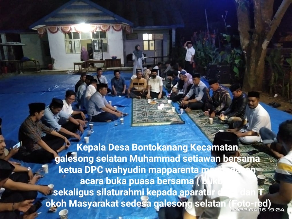 Kepala Desa Bontokanang Kecamatan galesong selatan Muhammad setiawan bersama ketua DPC Wahyudin Mapparenta serta Ketua APDESI Kab Takalar mengadakan acara buka puasa bersama ( bukber ) sekaligus silaturahmi kepada aparatur desa dan Tokoh Masyarakat sedesa galesong selatan, sabtu (16/04/2022).