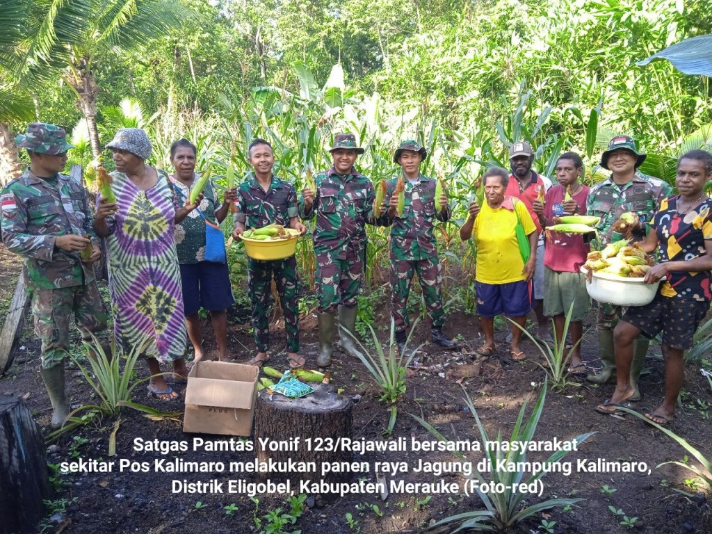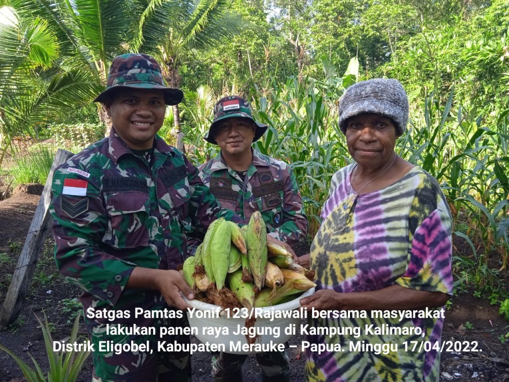 Satgas Pamtas Yonif 123/Rajawali bersama masyarakat sekitar Pos Kalimaro melakukan panen raya Jagung di kebun percontohan Pos Kalimaro di Kampung Kalimaro, Distrik Eligobel, Kabupaten Merauke – Papua. Minggu 17/04/2022.