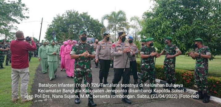 Batalyon Infanteri (Yonif) 726/Tamalate tepatnya di Kelurahan Bulujaya Kecamatan Bangkala Kabupaten Jeneponto disambangi Kapolda Sulsel Irjen Pol Drs. Nana Sujana, M.M., berserta rombongan. Sabtu, (23/04/2022).
