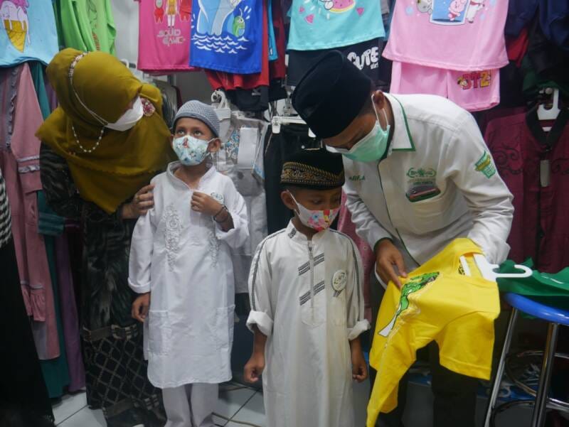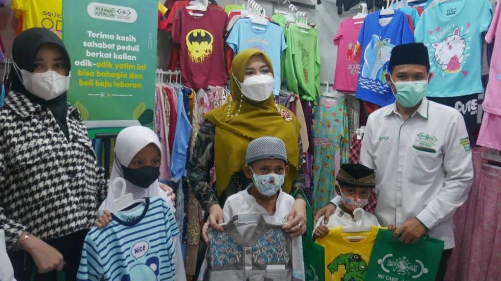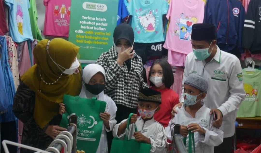 Dengan sabar dan telaten, Ahmad Afif Amrulloh Ketua NU Care-Lazisnu Jawa Timur meladeni, beberapa anak yatim memilih baju lebaran di salah satu mall di kota metropolis ini, Minggu (24/4/2022).