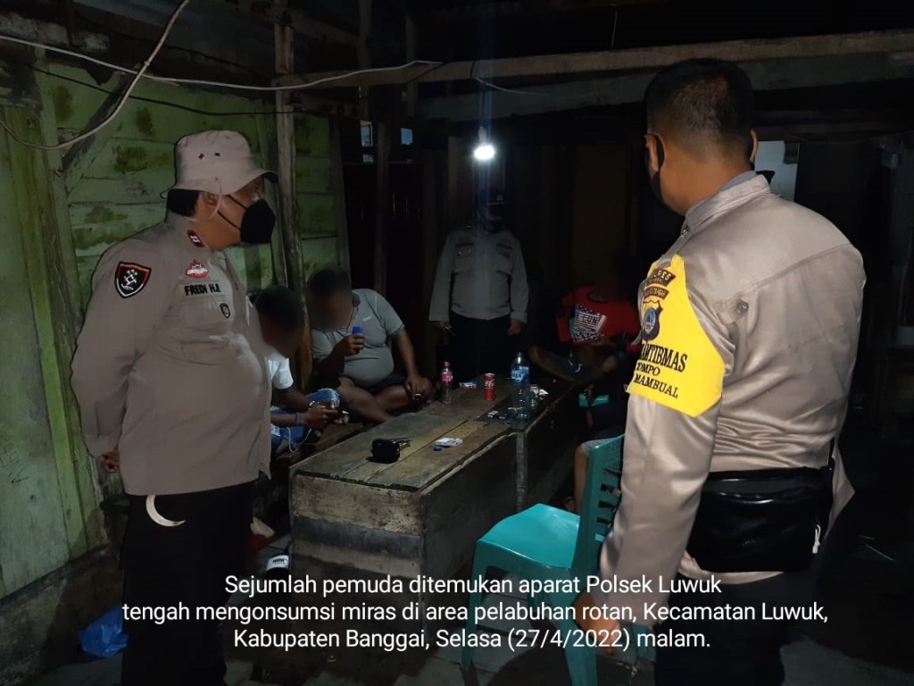 Sejumlah pemuda ditemukan aparat Polsek Luwuk tengah mengonsumsi miras di area pelabuhan rotan, Kecamatan Luwuk, Kabupaten Banggai, Selasa (27/4/2022) malam.