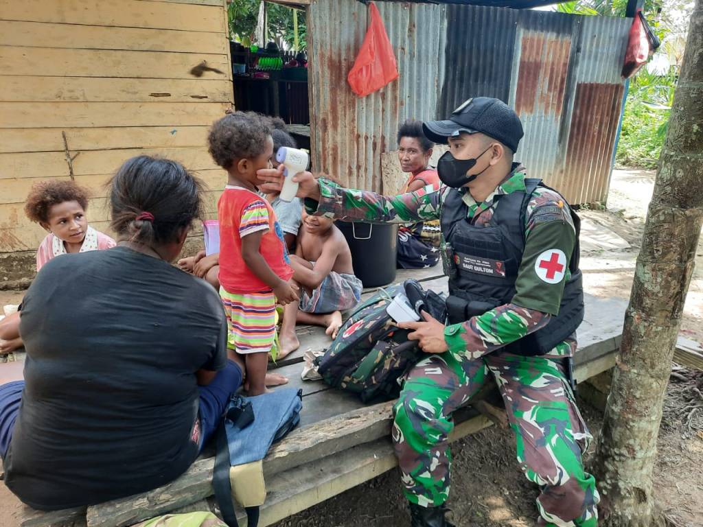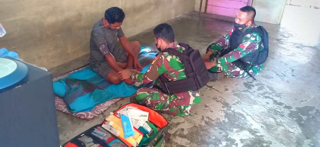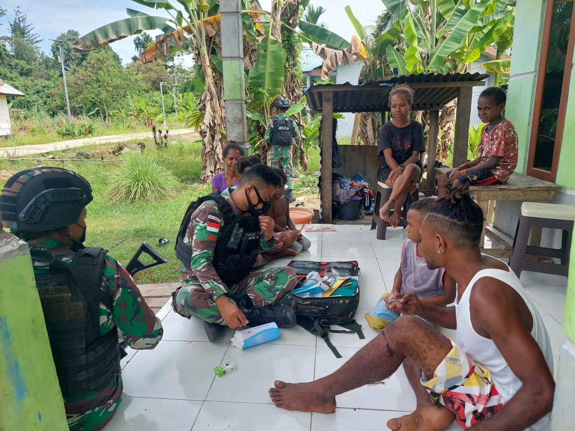 Dalam rangka membantu meningkatkan kualitas kesehatan masyarakat, Satgas Pamtas RI-PNG Yonif 711/Rks Pos Mosso melaksanakan kegiatan pengobatan keliling kepada masyarakat di Kampung Mosso, Distrik Muara Tami, Kota Jayapura, Papua. Selasa (26/04/2022).