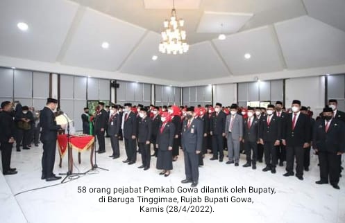 Bupati Gowa, Adnan Purichta Ichsan melantik 58 orang pejabat Pemkab Gowa diantaranya empat Jabatan Pimpinan Tinggi Pratama, 31 Jabatan Administrator dan 23 Jabatan Pengawas Lingkup Pemkab Gowa di Baruga Tinggimae, Rujab Bupati Gowa, Kamis (28/4/2022).
