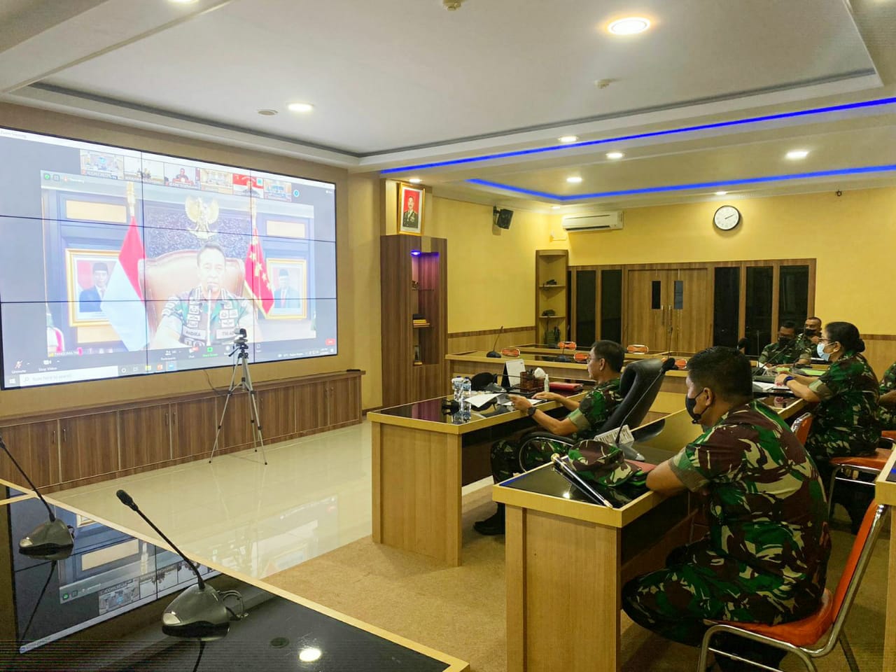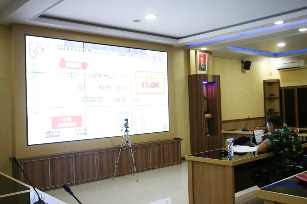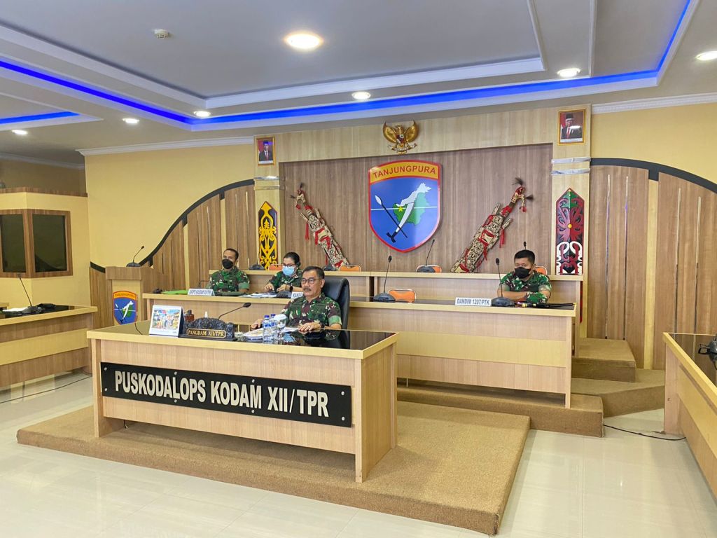 Dari Ruang Rapat Puskodalopsdam XII/Tpr, Panglima Kodam XII/Tanjungpura, Mayjen TNI Sulaiman Agusto, S.I.P., M.M., mengikuti video conference (Vicon) bersama dengan Panglima TNI Jenderal TNI Andika Perkasa dalam rangka rapat evaluasi hasil pencapaian vaksinasi Covid-19 selama bulan Ramadhan 1443/H