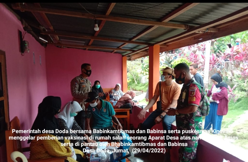 Dalam rangka program percepatan Vaksinasi Dosis 3 (Booster) di kabupaten Sigi maka pemerintah desa Doda bersama Babinkamtibmas dan Babinsa serta puskesmas Kinovaro menggelar pemberian vaksinasi bertempat di rumah salah seorang Aparat Desa atas nama Bapak Amos serta di pantau oleh Bhabinkamtibmas dan Babinsa Desa Doda, Jumat, (29/04/2022).