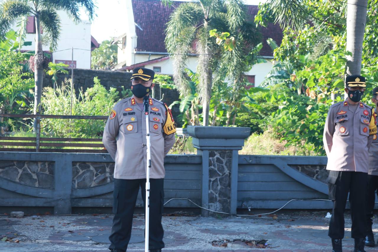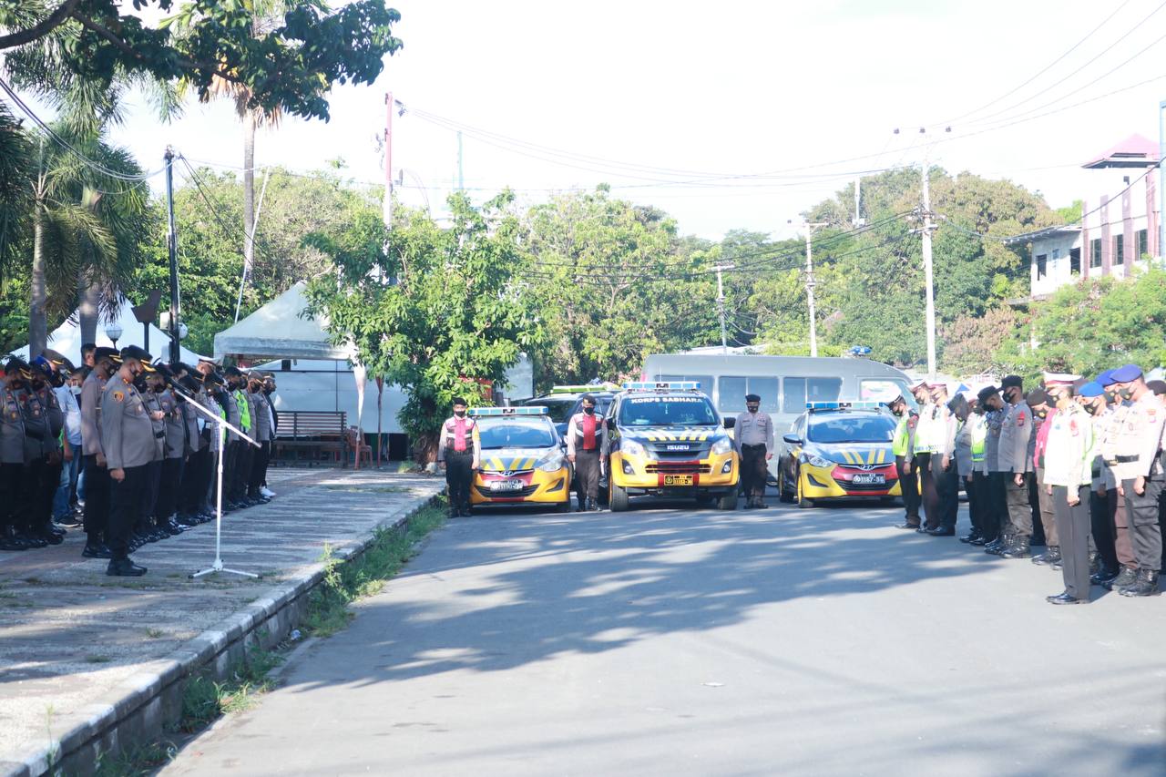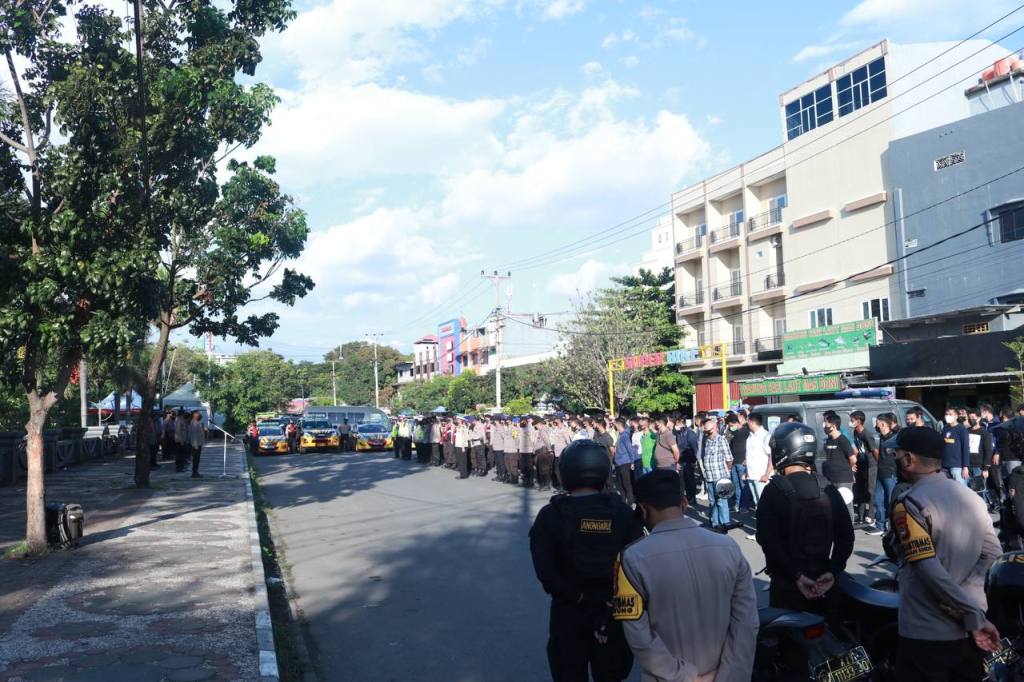 Kepolisian Resor Pelabuhan Makassar menggelar Apel siaga dalam rangka patroli pemantauan takbir keliling dan pengamanan malam takbiran pada malam Idul Fitri 1443H/2022 didepan Mapolres tersebut,