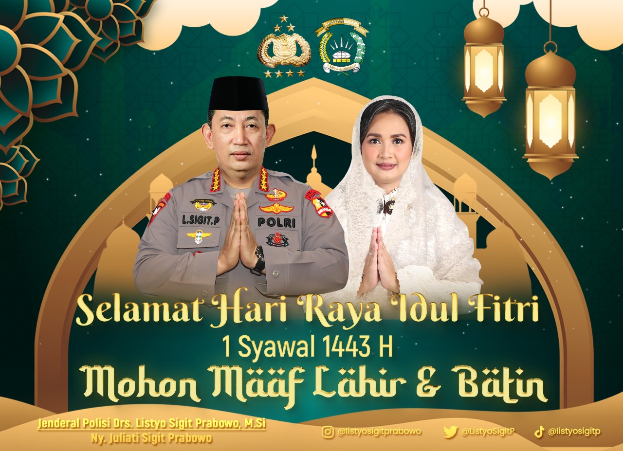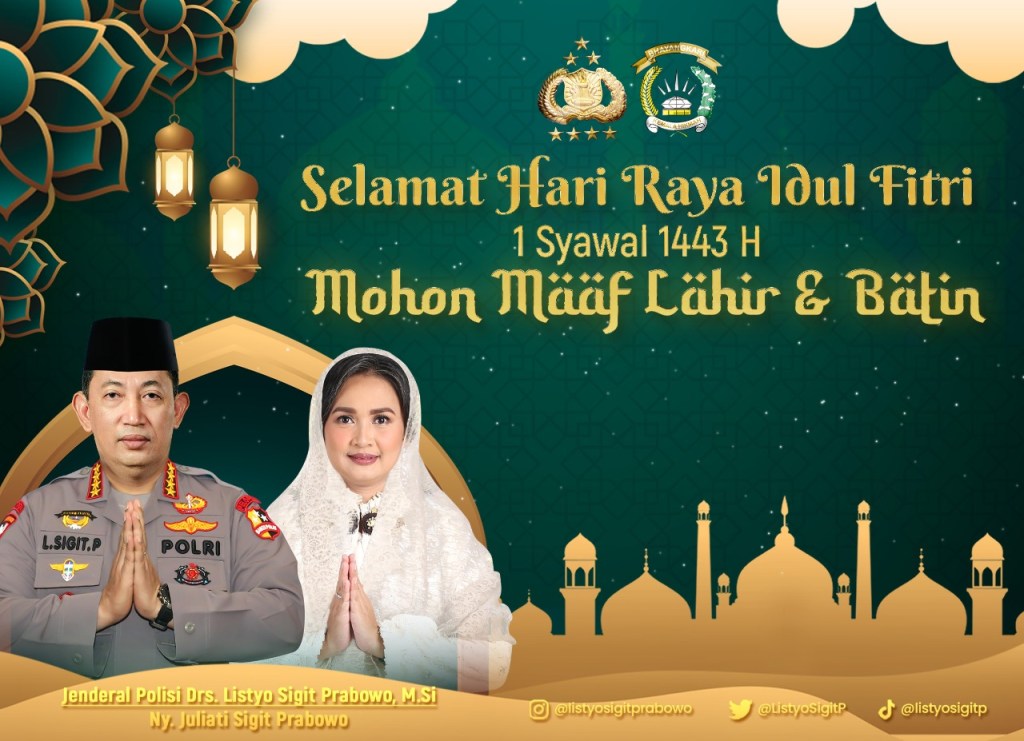 Kapolri Jenderal Listyo Sigit Prabowo menyampaikan selamat merayakan Hari Raya Idul Fitri 1443 Hijriah kepada seluruh umat Muslim di Indonesia. Ia berharap perayaan ini dapat dijadikan momentum untuk seluruh masyarakat kembali ke fitrah.