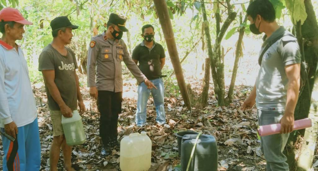 Dengan melewati jalan setapak pada perkebunan coklat warga tempat penyulingan pembuatan cap tikus berhasil diungkap, yang kemudian dilakukan pembongkaran.