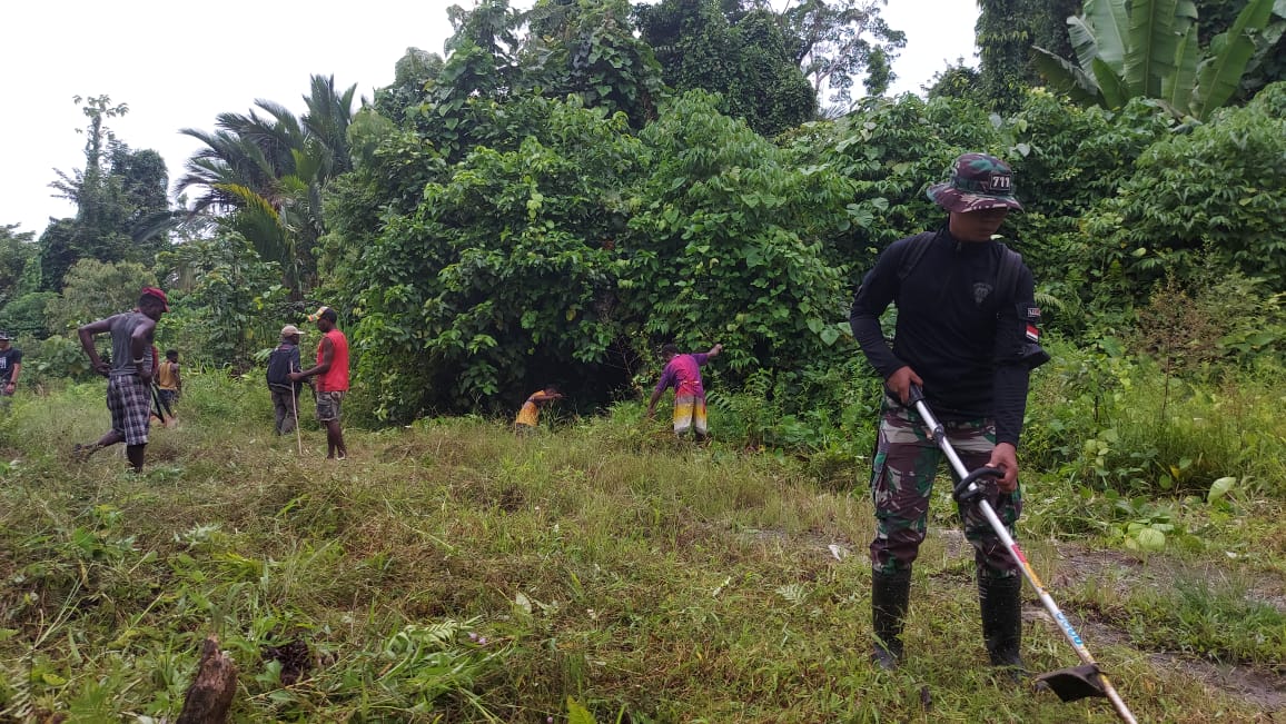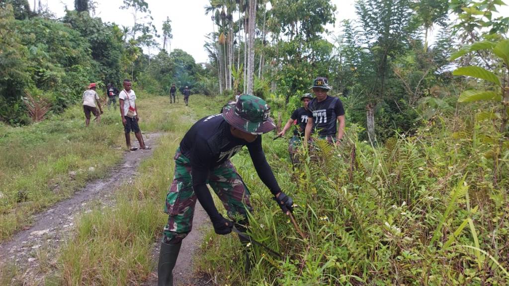 Dalam upaya meningkatkan ketertiban, kebersihan dan keindahan lingkungan, sekaligus memupuk kebersamaan dengan warga di daerah perbatasan, Satgas Pamtas RI-PNG Yonif 711/Rks Pos Kaliasin bersama warga melaksanakan karya bakti membersihkan jalan poros Kantor Desa di Kampung Kibay, Distrik Arso Timur, Kabupaten Keerom, Papua, Jumat (6/5/2022).