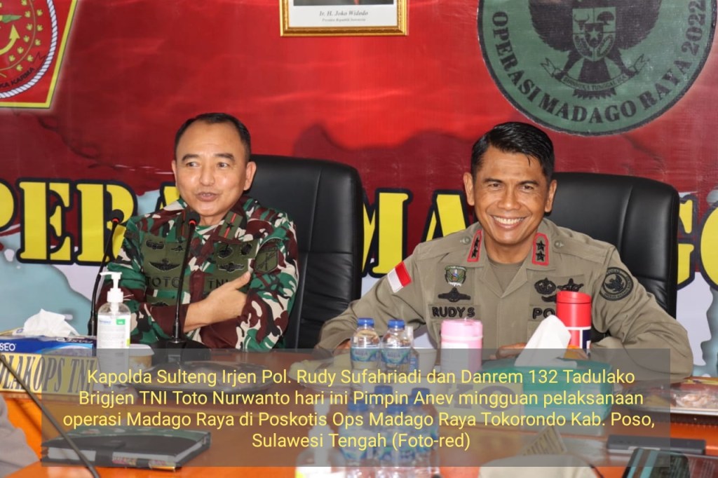 Kapolda Sulteng Irjen Pol. Rudy Sufahriadi dan Danrem 132 Tadulako Brigjen TNI Toto Nurwanto hari ini memimpin analisa dan evaluasi (anev) mingguan pelaksanaan operasi Madago Raya di Poskotis Ops Madago Raya Tokorondo Kab. Poso, Sulawesi Tengah, Rabu (11/5/2022)