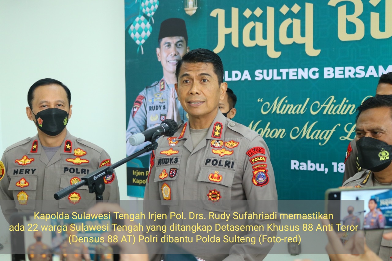 Kapolda Sulawesi Tengah Irjen Pol. Drs. Rudy Sufahriadi memastikan ada 22 warga Sulawesi Tengah yang ditangkap Detasemen Khusus 88 Anti Teror (Densus 88 AT) Polri dibantu Polda Sulteng rentang waktu tanggal 14-16 Mei 2022