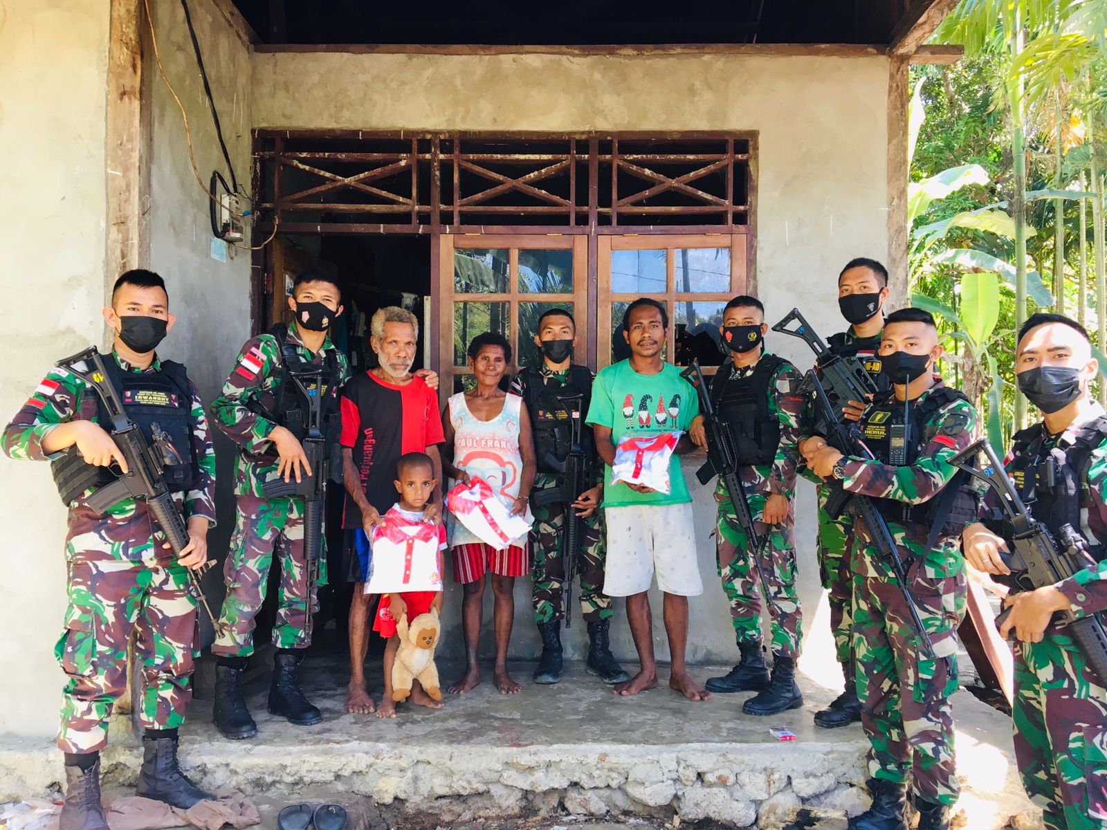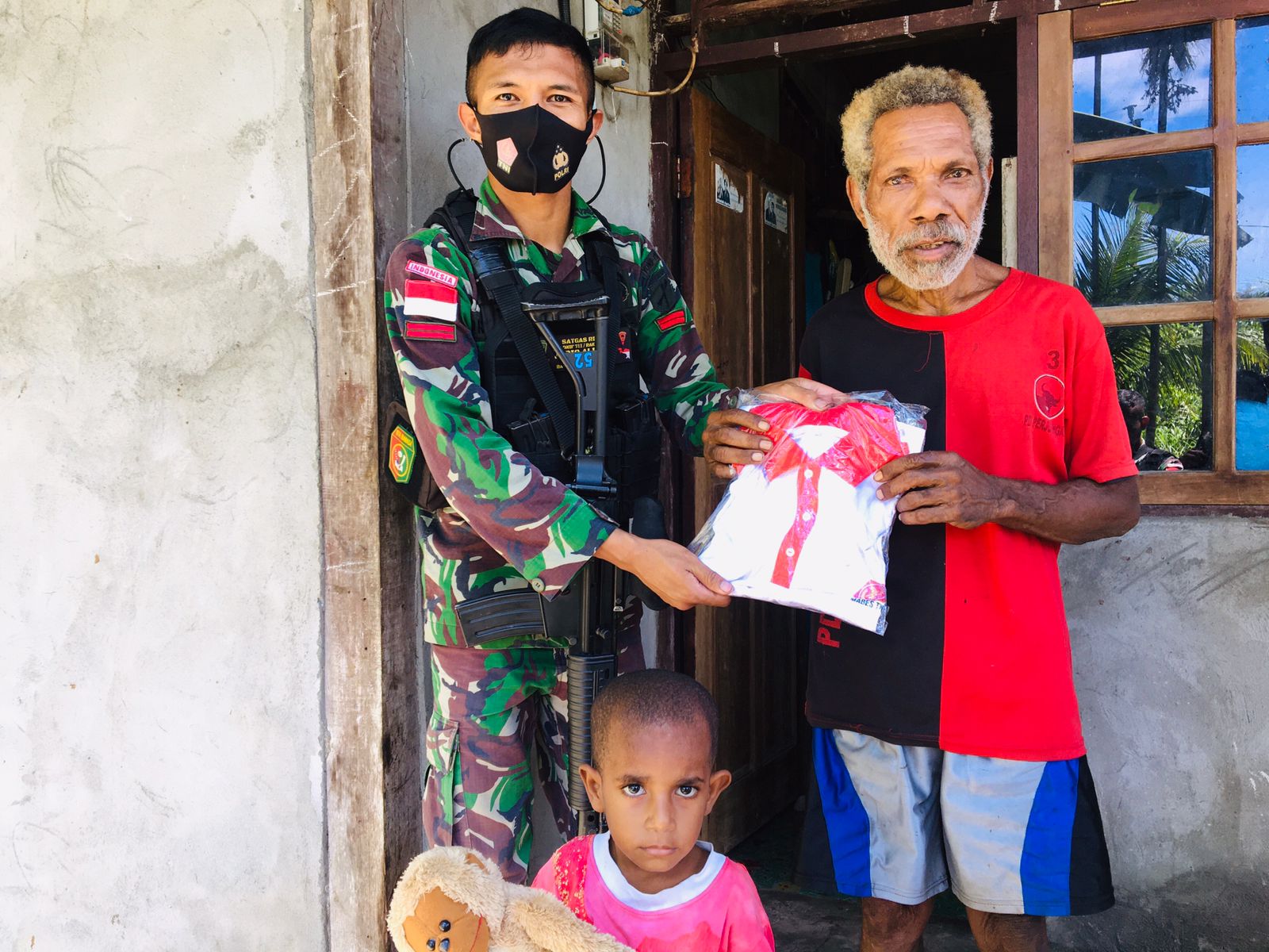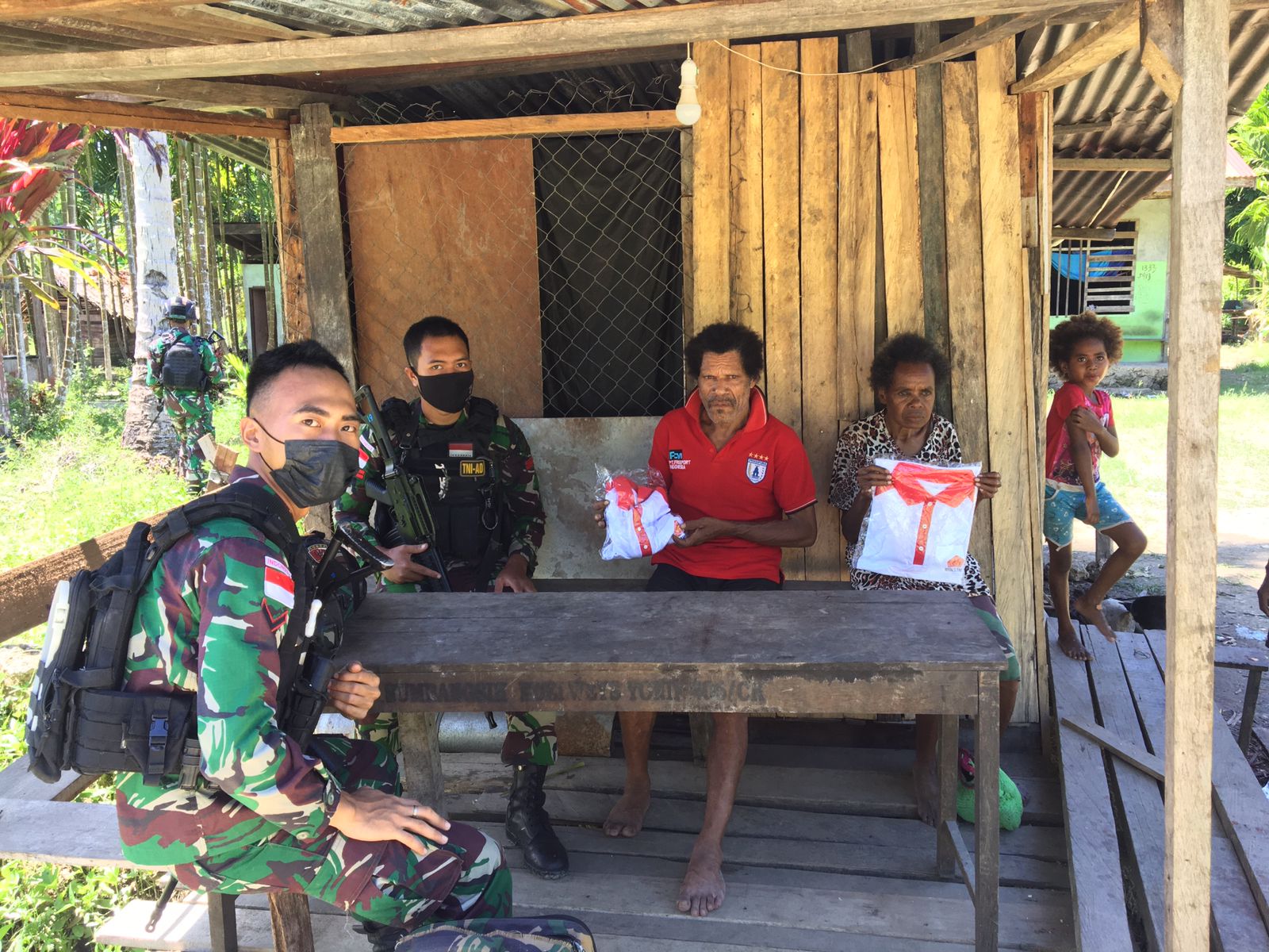 Sebagai wujud kepedulian dan kecintaan terhadap warga, anggota Satgas Pamtas RI-PNG Yonif 711/Rks Pos Wambes memberikan bantuan berupa pakaian baju merah putih kepada warga Kampung Wambes, Distrik Arso Timur, Kabupaten Keerom Papua, Sabtu (21/5/2022).