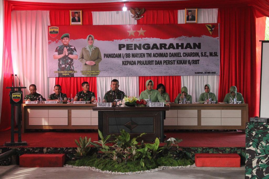 Pangdam I/BB, Mayjen TNI Achmad Daniel Chardin, SE, MSi, menegaskan, Prajurit yang berpikiran maju. Selalu berpikir positif, bila ada masalah tidak fokus kepada masalahnya saja tapi fokus juga bagaimana mengatasinya dengan cara meningkatkan prestasi,” ucap Pangdam saat memberi pengarahan di Markas Kompi Kavaleri 6/Rajawali Bhakti Tama (Kikav 6/RBT) di Kabupaten Kampar, Riau, Selasa (24/5/2022).
