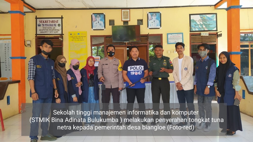 Sekolah tinggi manajemen informatika dan komputer (STMIK Bina Adinata Bulukumba ) melakukan penyerahan tongkat tuna netra kepada pemerintah desa biangloe.