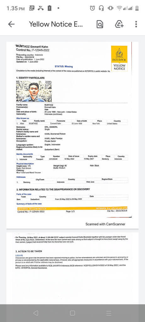 Polri menyatakan bahwa Interpol telah menerbitkan atau merilis Yellow Notice terkait hilangnya Putra Sulung Gubernur Jawa Barat Ridwan Kamil, Emmeril Khan Mumtadz atau biasa dipanggil Eril di sungai Aaree, Swiss.