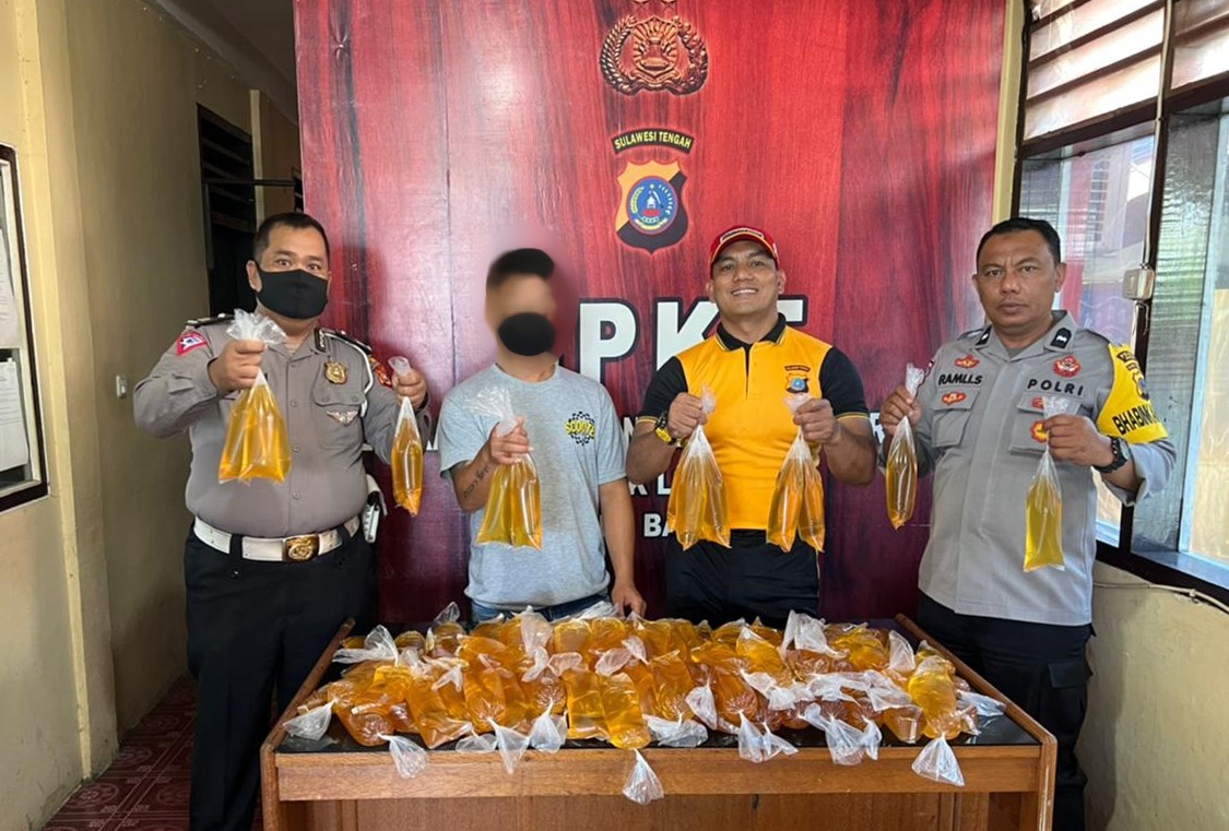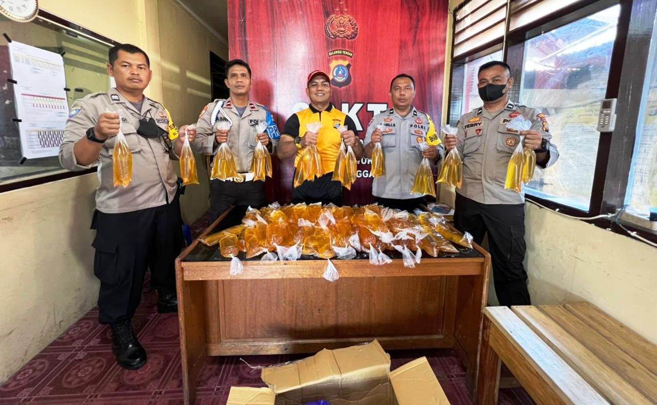 Ratusan liter Minuman Keras (Miras) tradisional jenis cap tikus yang akan diselundupkan ke wilayah Kintom, Kabupaten Banggai disita jajaran Polsek Luwuk, Jumat (3/6/2022).