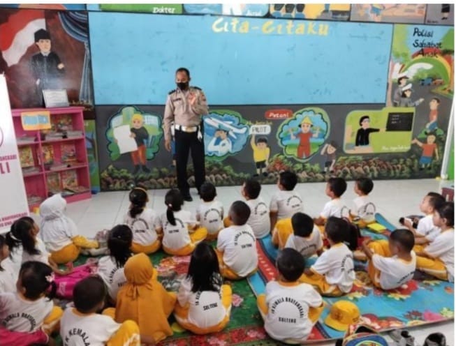 Satuan Lalu Lintas (Sat Lantas) Polres Touna melalui Unit Kamsel melaksanakan melaksanakan kegiatan Polisi Sahabat Anak (Polsana) di TK Kemala Bhayangkari 13 Touna, Jumat (03/06/2022).