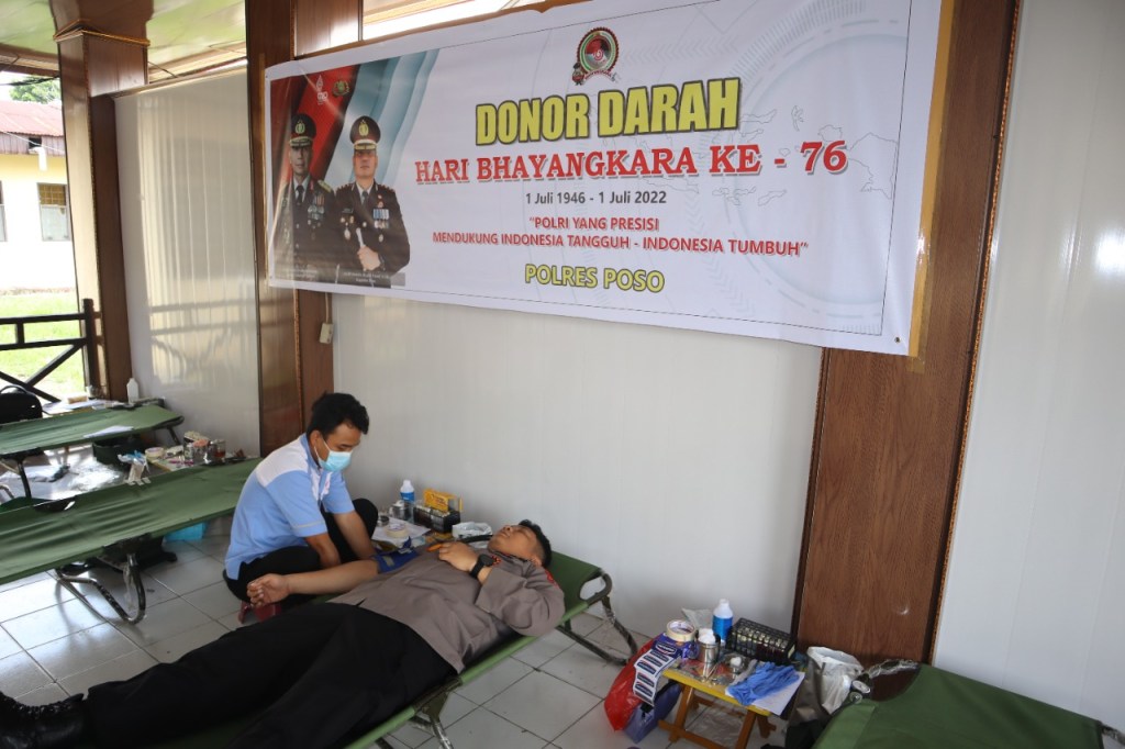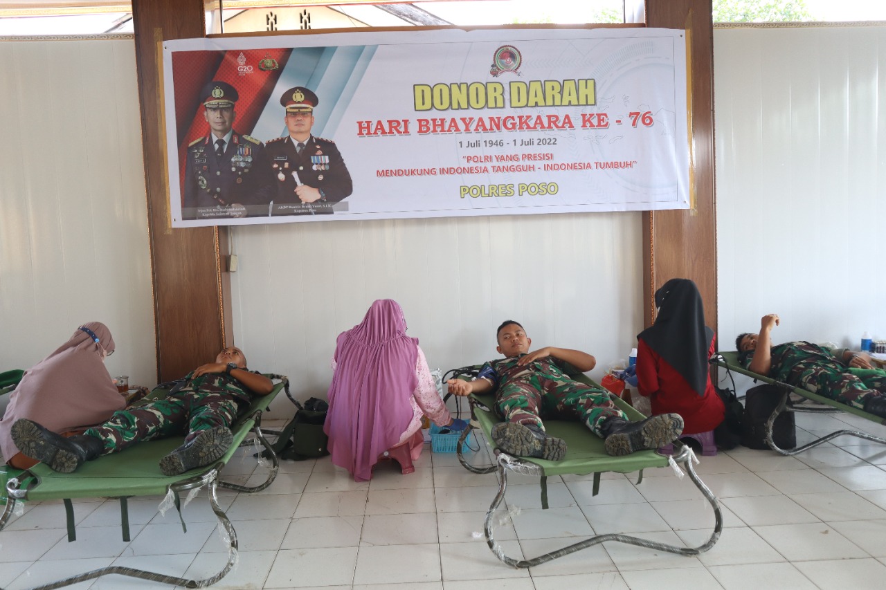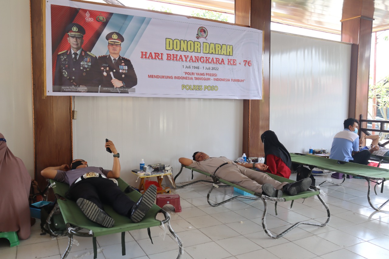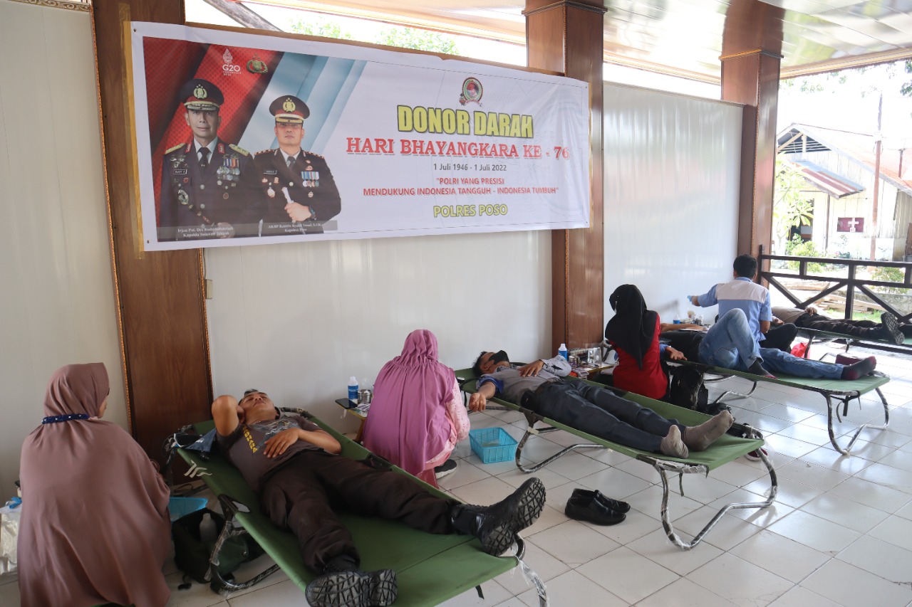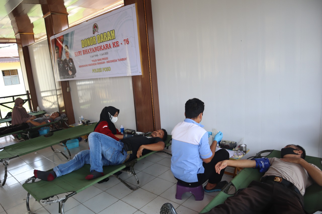 Kepolisian Resor Poso Polda Sulawesi Tengah menggelar bakti sosial donor darah Jelang hari Bhayangkara ke-76 yang jatuh pada tanggal 1 Juli 2022.