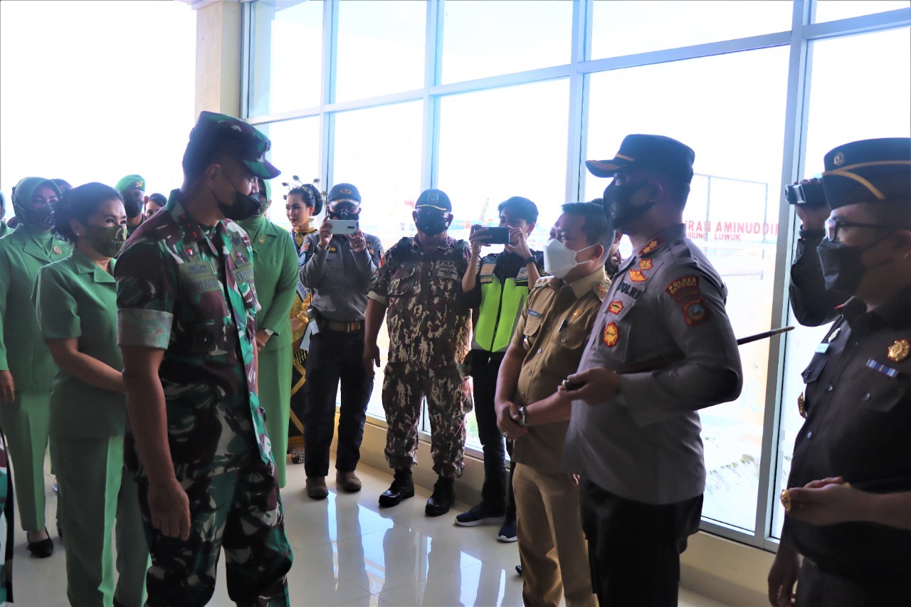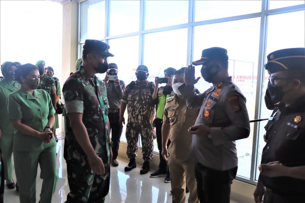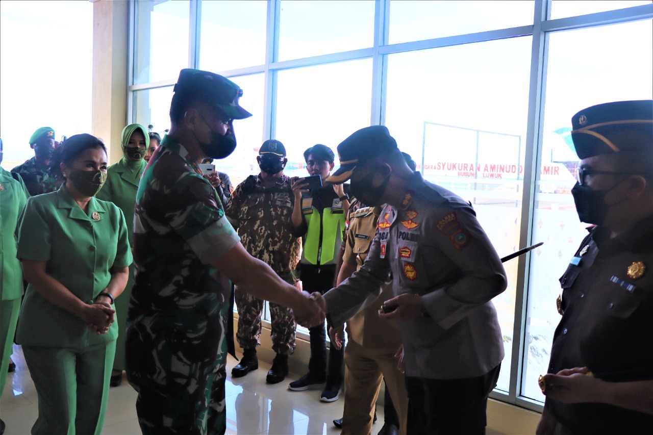 Kapolres Banggai AKBP Yoga Priyahutama SH, SIK, MH, bersama Bupati Banggai, Ir. H. Amirudin dan unsur Forkopimda menyambut kedatangan Panglima Komando Daerah Militer (Pangdam) XIII/Merdeka, Mayor Jenderal TNI Alfret Denny Djoike Tuejeh, di Bandara Syukuran Aminudin Amir, Desa Bubung, Kecamatan Luwuk Selatan, pada Selasa (7/6/2022).