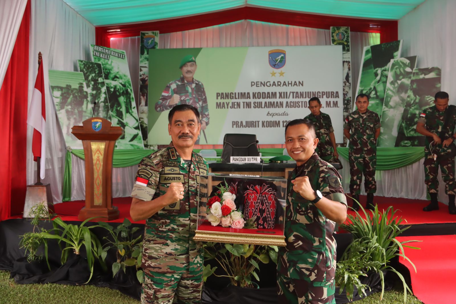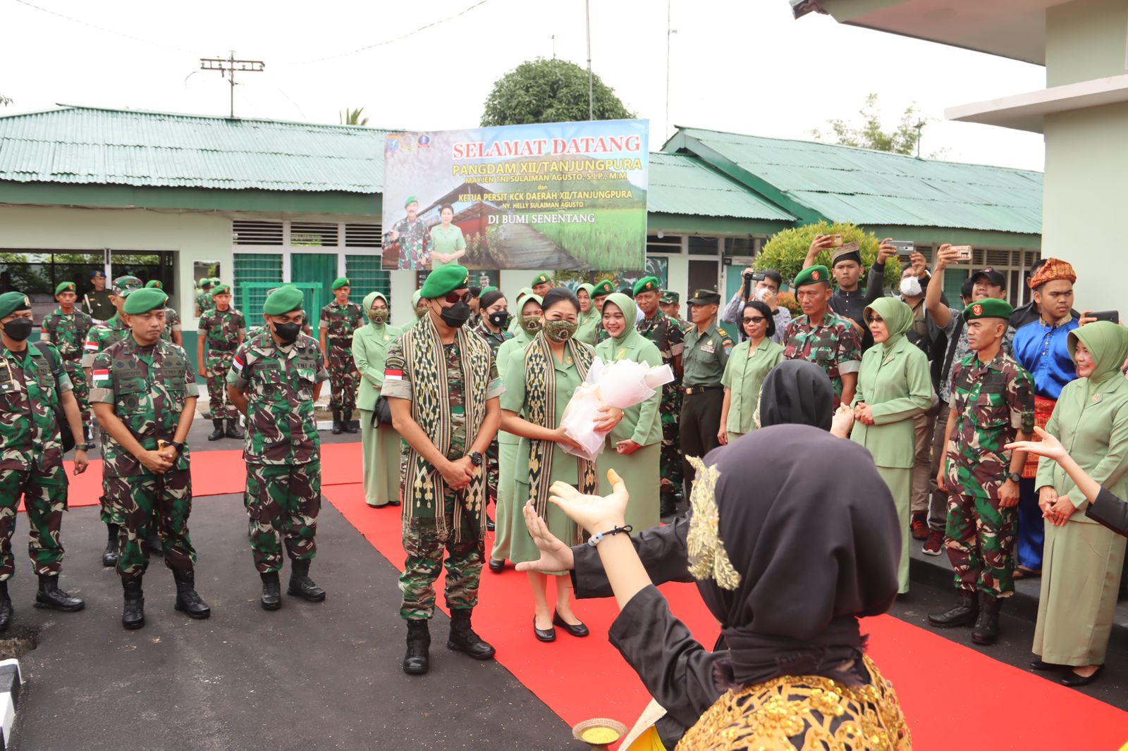 Pangdam XII/Tpr beserta rombongan disambut Dandim 1205/Stg, Letkol Inf Kukuh Suharwiyono, Ketua Persit KCK Cabang XLIX Kodim Sintang, Ny. Nia Kukuh Suharwiyono, Kasdim 1205/Stg, para Perwira Staf dan Danramil, para Prajurit serta Persit.