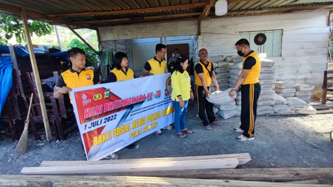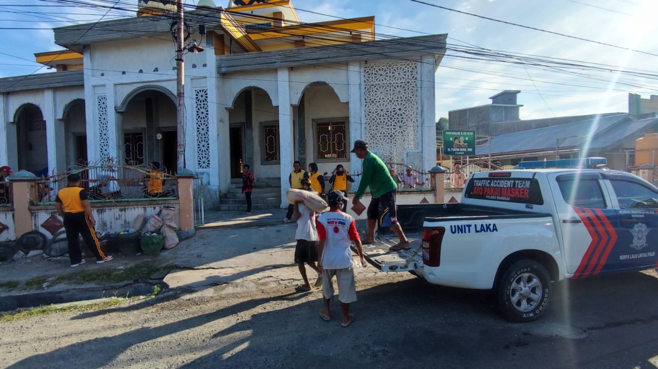 Selain melakukan pembersihan, Satlantas Polres Banggai juga menyalurkan bantuan bahan material berupa semen di Masjid Nurul Iman Kilongan dan Gereja Betel Luwuk.