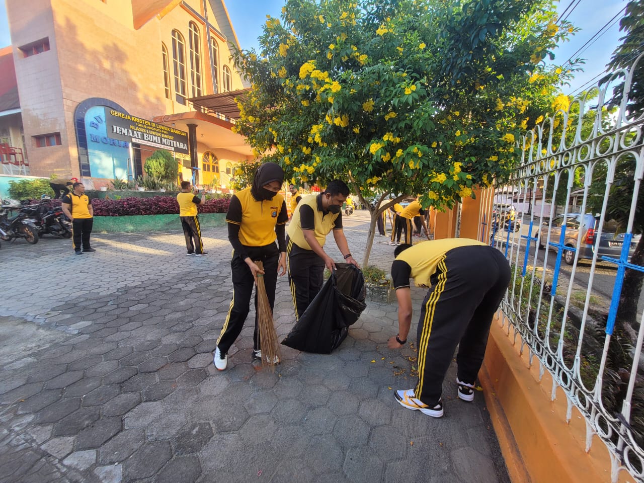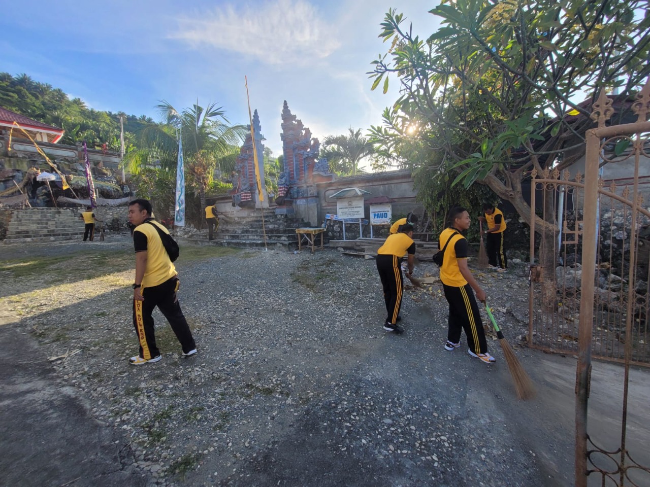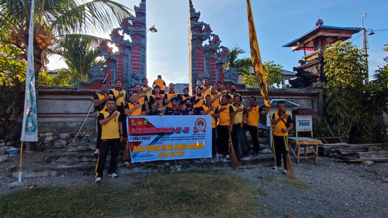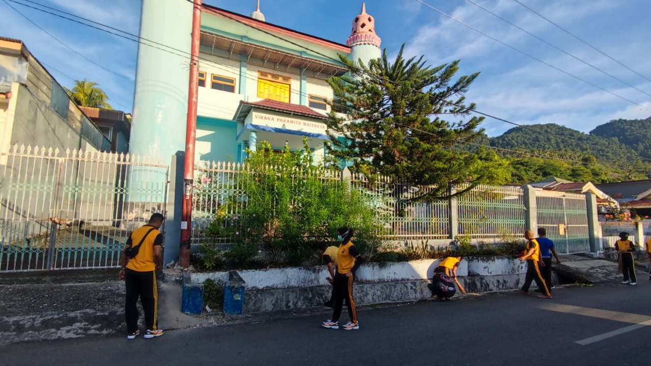 Personil Satlantas Polres Banggai dipimpin Kasat Lantas AKP I Dewa Made Arda, SH, SIK, melaksanakan bakti sosial bersih-bersih di sejumlah rumah ibadah di Kota Luwuk, Jumat (10/6/2022).