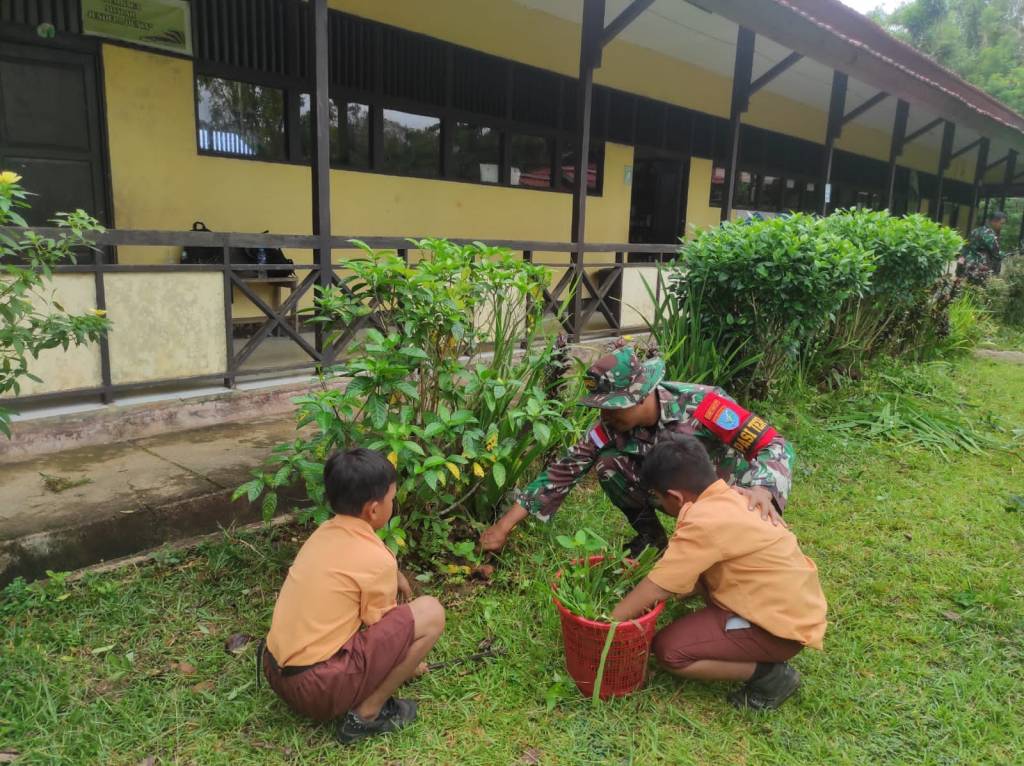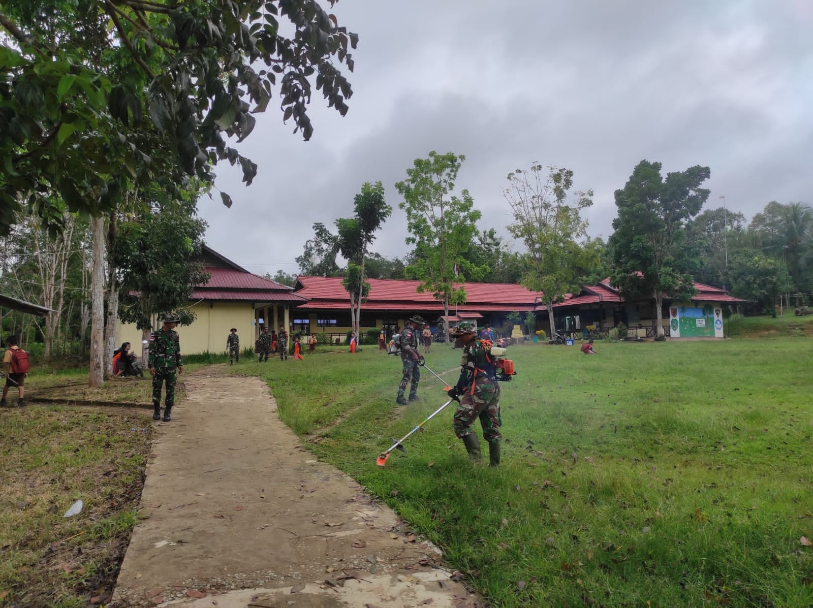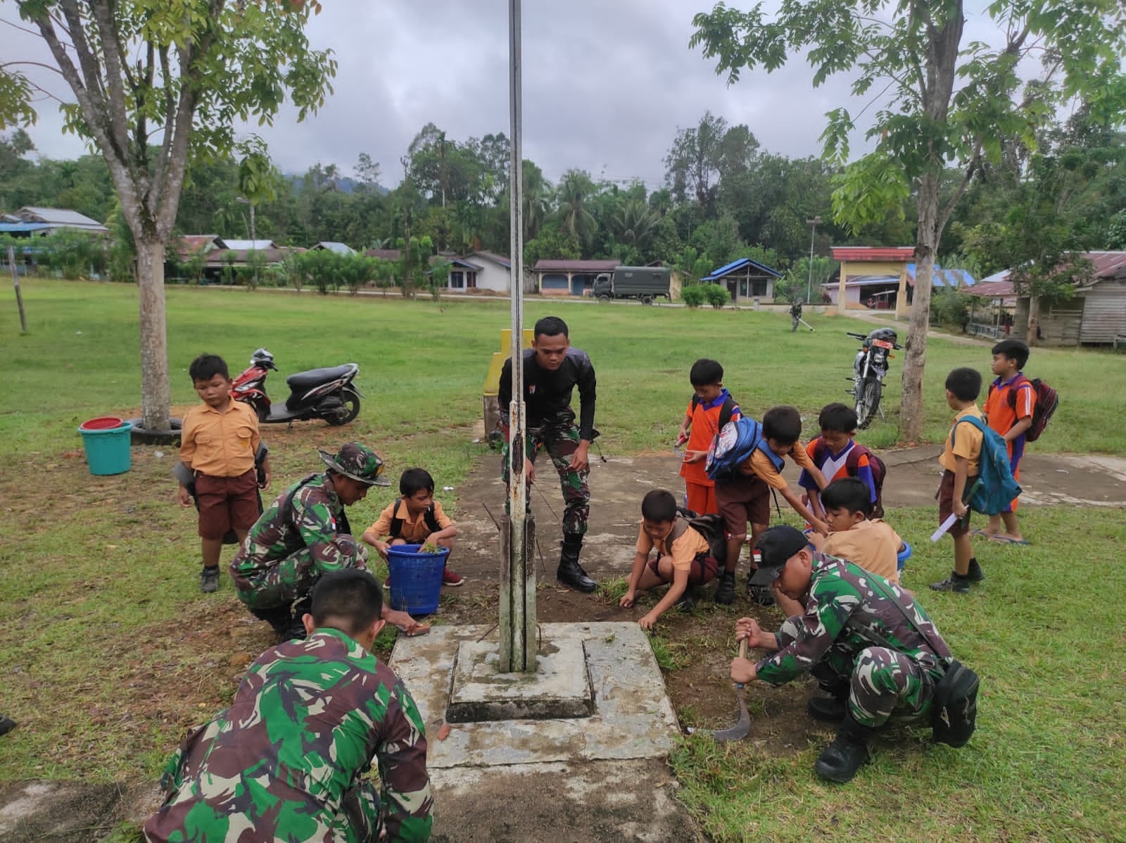 Pentingnya kebersihan lingkungan sekolah, Satgas Pamtas Yonif 645/Gty melakukan karya bakti membersihkan Area Sekolah dan Lapangan Upacara bersama Siswa/Siswi SDN 08 Risau Dusun Risau Desa Jagoi Babang Kab. Bengkayang.