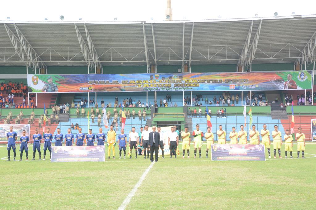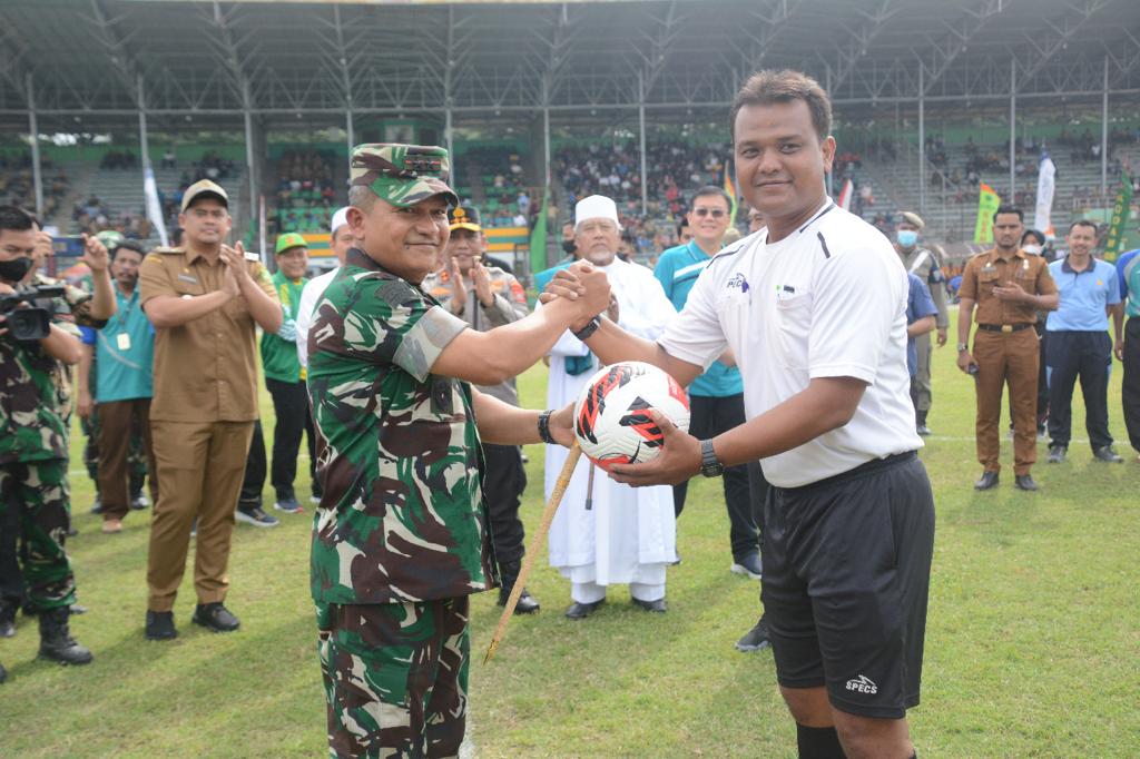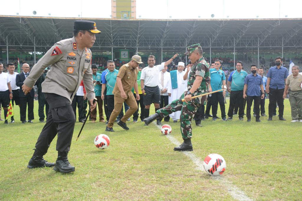 Pangdam I/BB, Mayjen TNI Achmad Daniel Chardin, SE, MSi, bersama Kapoldasu, Irjen Pol RZ Panca Putra Simanjuntak, MSi, dan unsur Forkopimda Sumut lainnya melakukan kick off turnamen sepak bola Piala Kasad Liga Santri PSSI Tahun 2022 Wilayah Kota Medan bertempat di Stadion Teladan Medan, Senin (20/6/2022) sore.