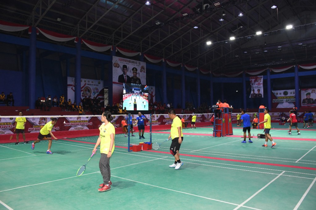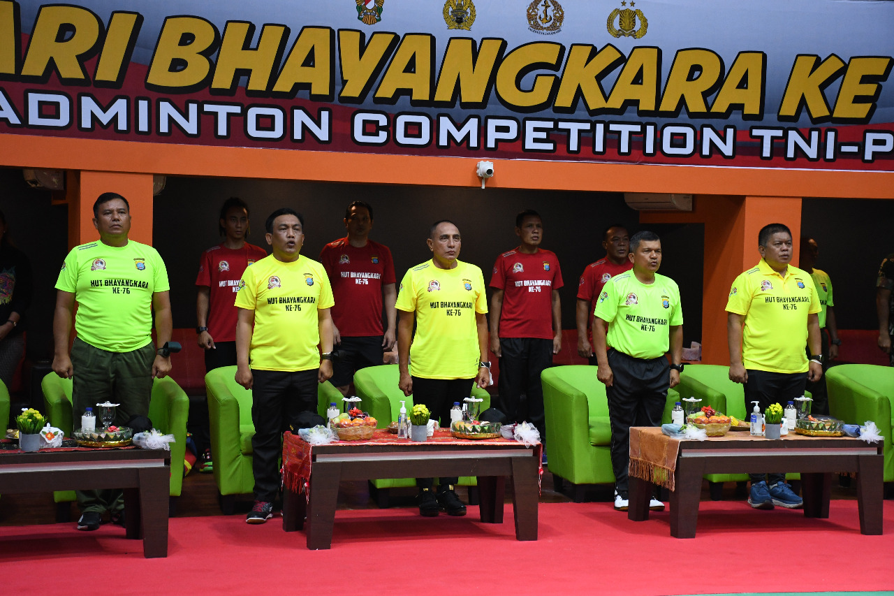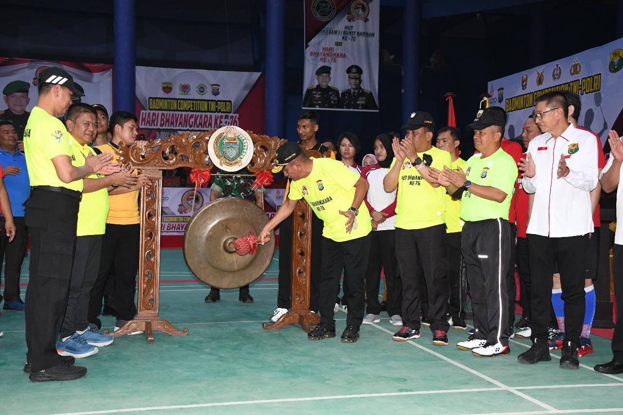 Pembukaan Turnamen Badminton TNI-Polri menyambut HUT ke-76 Bhayangkara dan HUT ke 72 Kodam I/BB resmi dibuka dengan ditandai pemukulan Gong oleh Gubsu H. Edy Rahmayadi dan pemukulan shuttle cock oleh Forkopimda Sumut, Selasa (21/6/2022).