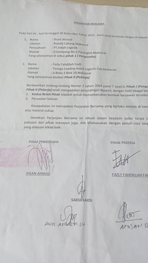 Kesepakatan Bipartit yang ditandatangani oleh perwakilan pengusaha atas nama Iksan Ahmad sebagai pihak 1, menjabat sebagai Kepala Cabang PT. Indah Logistik Makassar dan Fazly Fahdillah menjabat sebagai Tenaga Loading Indah Logistik dan Syarifuddin tenaga Security tertanggal 20 Mei 2022 dan disaksikan oleh Jamaluddin (Indah Logistik), Andi Akbar, SH (LBH) dan Arwan Rusli dengan isi sebagai berikut: