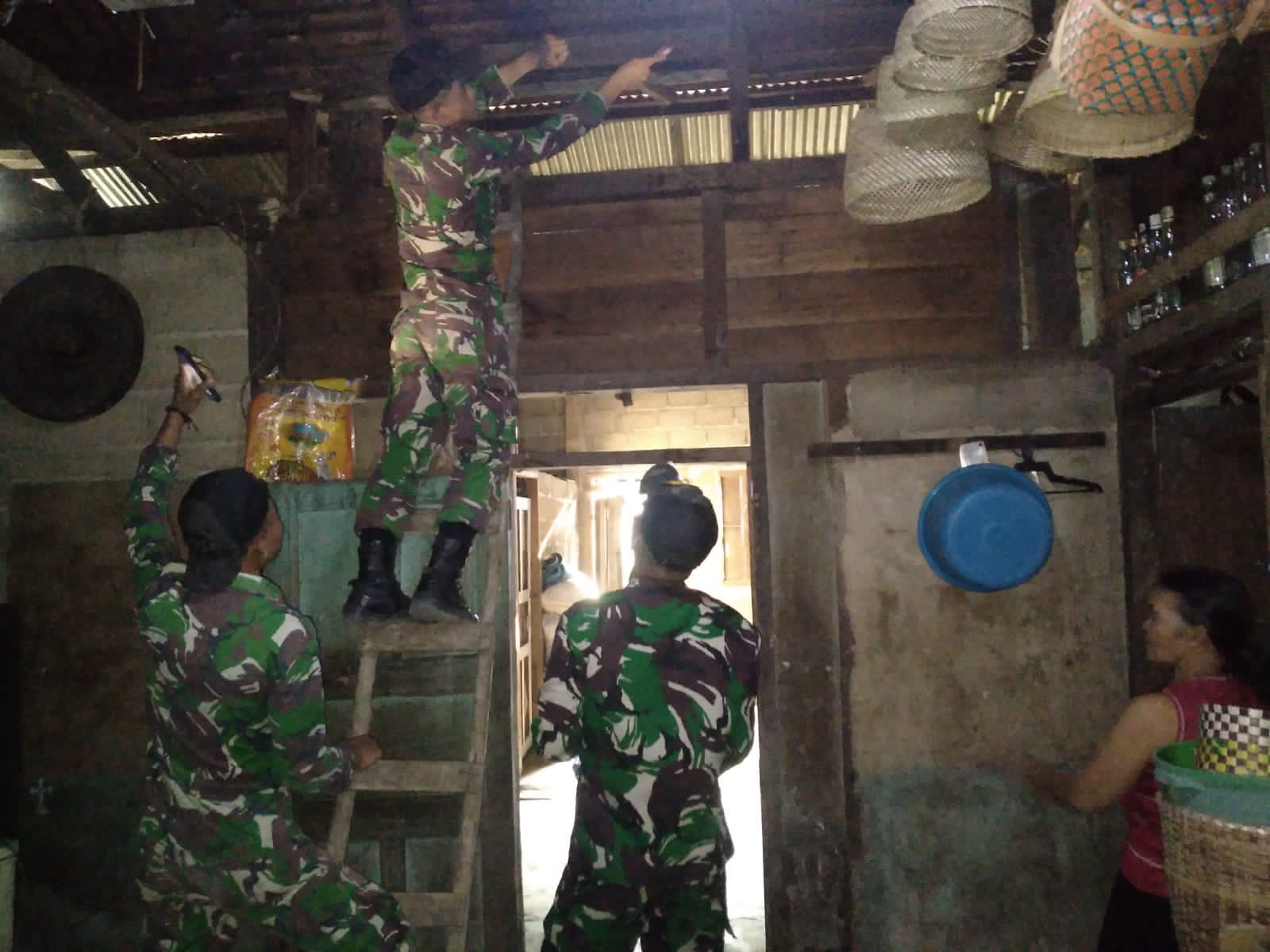 2 orang anggota Pos Panga Satgas Pamtas Yonif 645/Gty Prada Rodi dan Prada Selamet membantu merehab rumah ibu Kenteng salah satu warga di Dusun. Panga Desa. panga bintawa Kec. Entikong Kab. Sanggau.