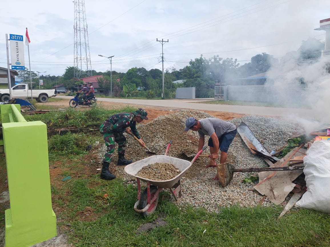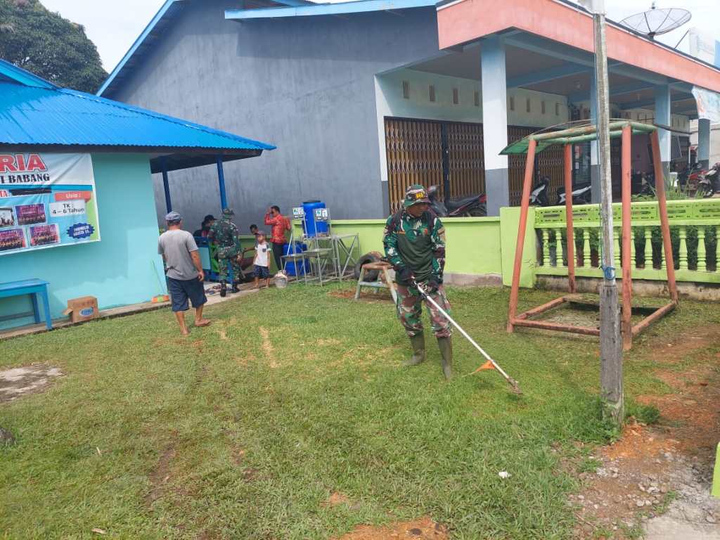 Anggota Satgas Pamtas RI-Malaysia Yonif 645/Gty mengajak warga untuk Karya Bakti membersihkan lingkungan sekolah di SDN 01 dan TK Ceria Jagoi Babang Desa. Jagoi Babang Kab. Bengkayang.