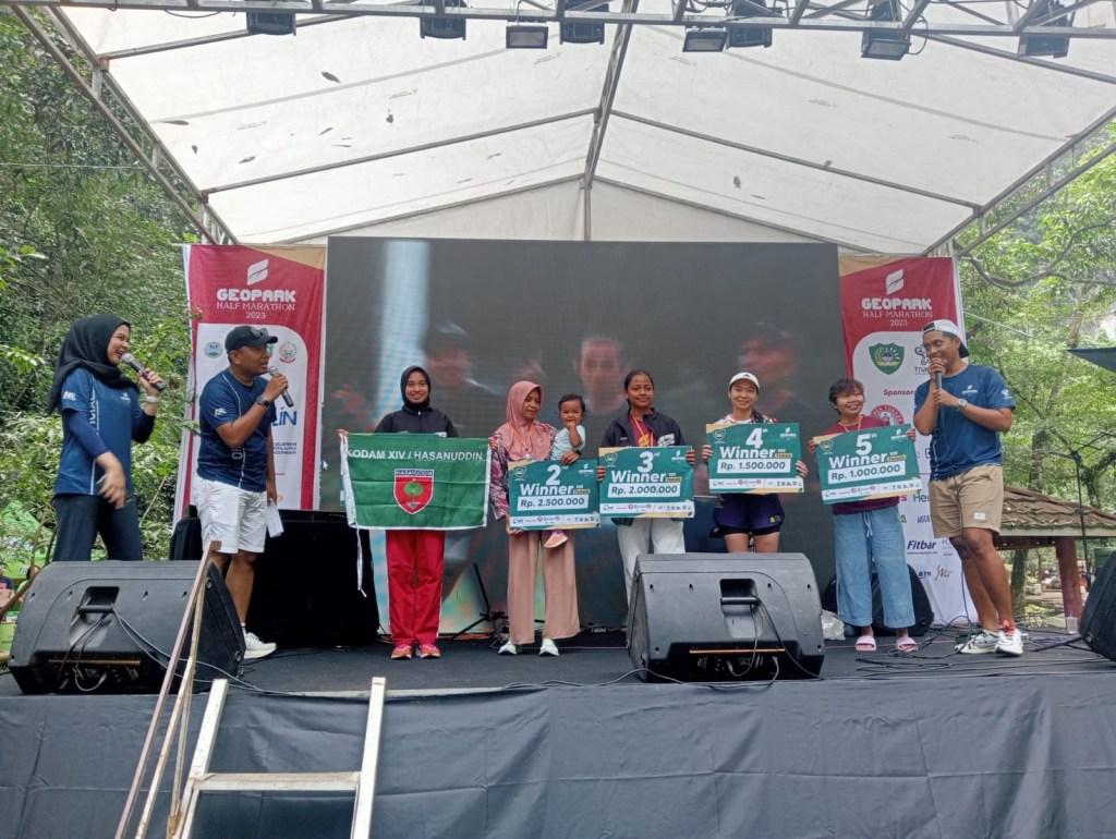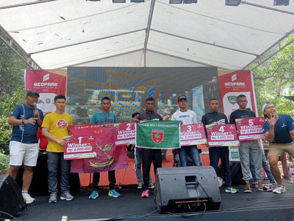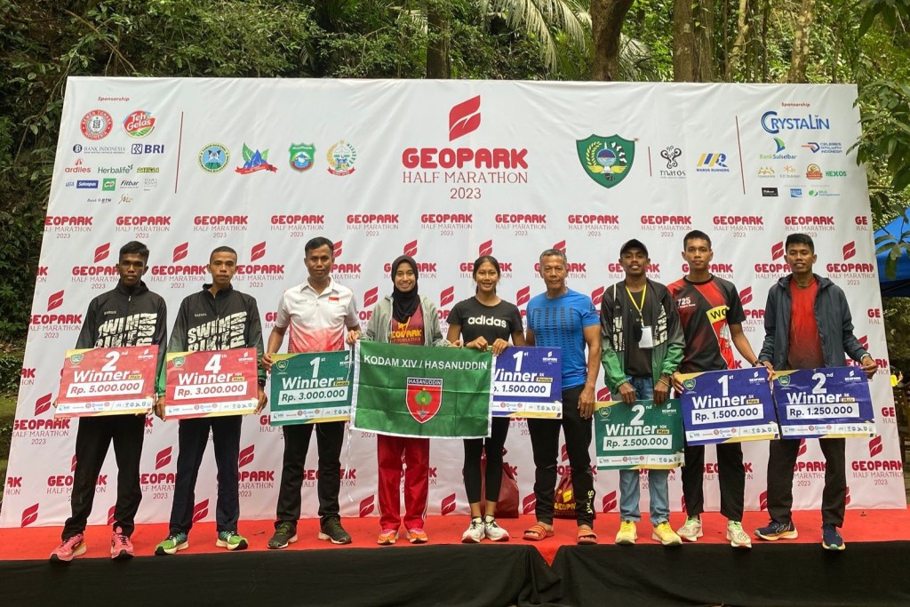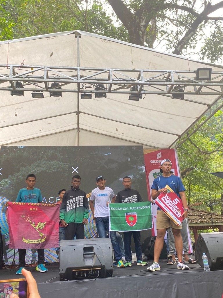 Atlet Triathlon Kodam XIV/Hasanuddin kembali menorehkan tinta emas di event lari Geopark Half Marathon yang dilaksanakan di kawasan Wisata alam Air Terjun Bantimurung, Kab. Maros. Minggu (25/06/2023).