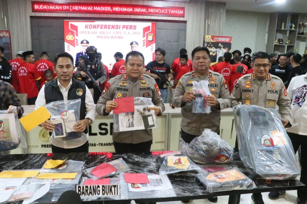Kapolda Sulsel Irjen Pol Drs. Setyo Boedi Moempoeni Harso, S.H., M.Hum. didampingi Wakapolda, Dirkrimum dan Kabid Humas Sulsel melaksanakan Press Release hasil Operasi SIKAT LIPU 2023 di Mapolda Sulsel, Kamis (27/06/2023).