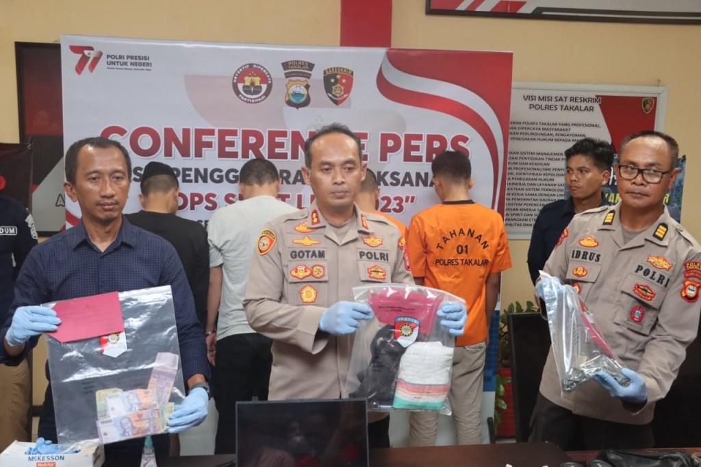 Kapolres Takalar AKBP Gotam Hidayat, S.I.K., M.Si memimpin langsung kegiatan Press Conference hasil Operasi Sikat Lipu 2023 bertempat di Lobby Sat Reskrim Polres Takalar, Selasa (27/6).