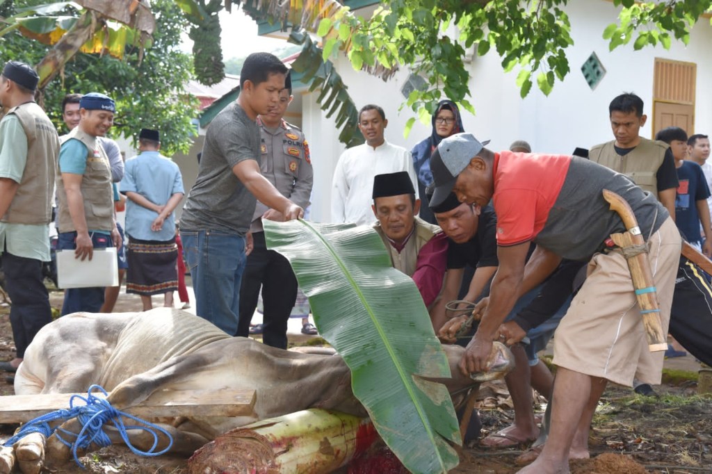 Sebanyak 9 ekor sapi dan 1 ekor kambing kurban disembelih di Mako Polres Morowali Utara.
