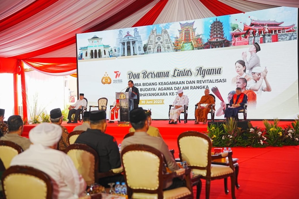 Kepolisian Negara Republik Indonesia (Polri) menggelar doa bersama dalam rangka Hari Bhayangkara ke-77 di Lapangan Bhayangkara Jakarta, Jumat (30/6/2023).